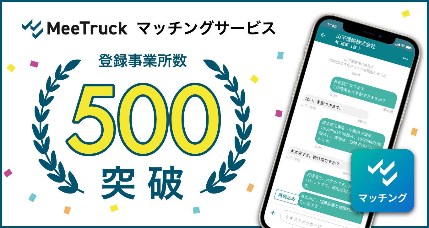 MeeTruck株式会社(ミートラック、本社:東京都港区、代表取締役社長 兼 CEO:横井 直樹、以下「MeeTruck」)が提供しておりますトラックのマッチングサービスの登録事業所数が、5月下旬に500事業所を突破いたしました。