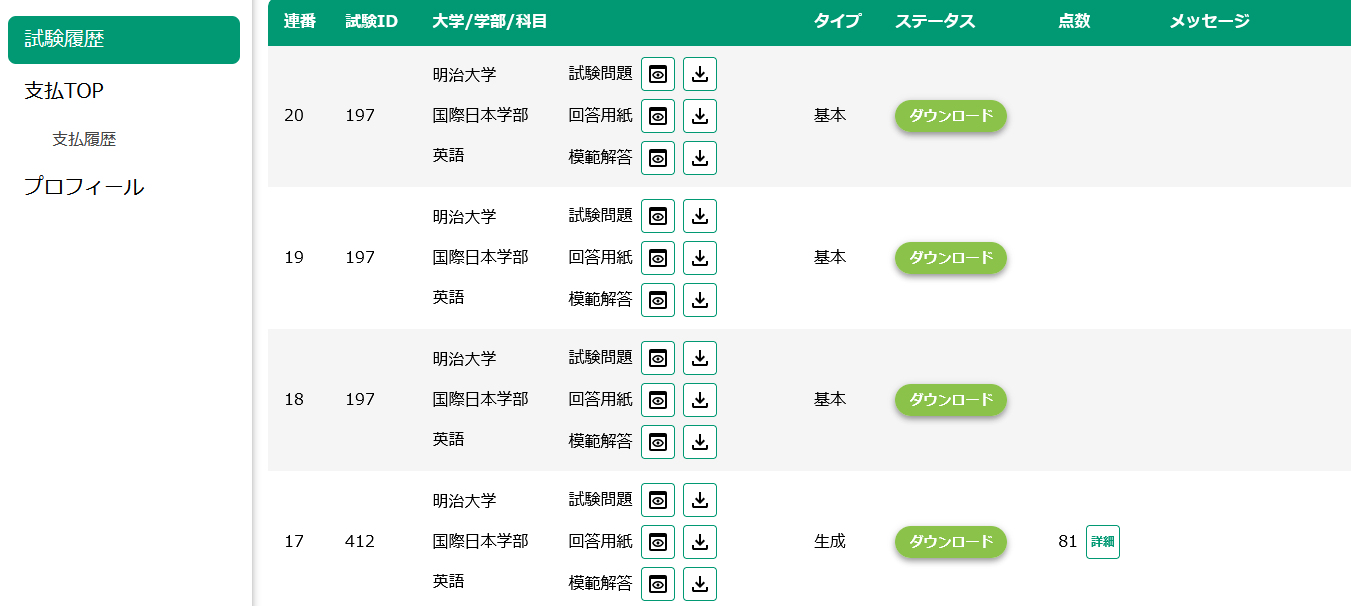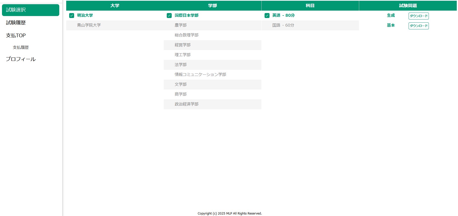 「Score Up」は、最新のAI技術を活用し、各大学の過去の入試データ、出題傾向、難易度、さらには問題の「クセ」までを徹底的に分析。その結果に基づき、本番さながらのリアルな予想問題を瞬時に作成・提供します (現在は、明治大学と青山学院大学の提供になります)。
