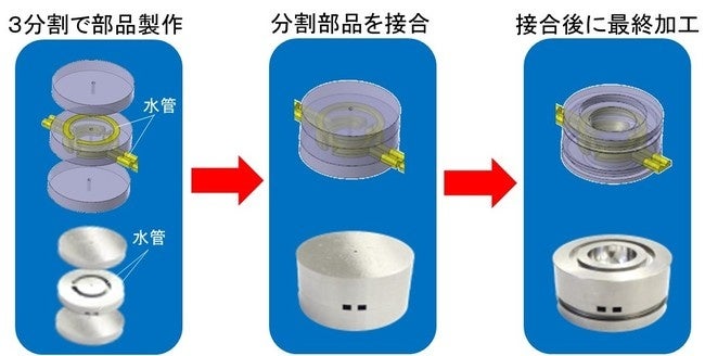 これまで、機械加工では難しく、金属3Dプリンタなどで製作していた複雑な形状の冷却水管などを含有する部品を、分割して製作し接合することで機械加工での製作を可能とする技術の開発を行っています。接合による部品製作は、金属3Dプリンタでの製作と比較し、製造工数が少ない、材料費が安価、材質選択肢が多い、製品強度が高いなどのメリットがあり、お客様の生産性向上や原価低減に貢献します。