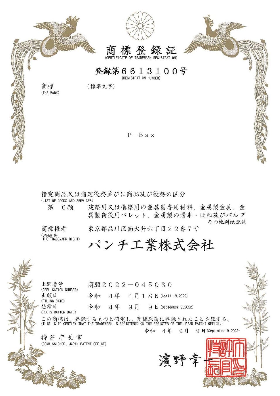 パンチ工業株式会社は、複数の金属部品や素材を、加圧しながら加熱することで一体化する技術「P-Bas」(ピーバス:Punch Bonding and sintering)の商標登録を特許庁に出願し、2022年9月9日付で登録が完了しました。2021年度の販売開始以来、お引き合いも順調に増加している同技術を通じて、お客様の生産性向上や原価低減に貢献してまいります。