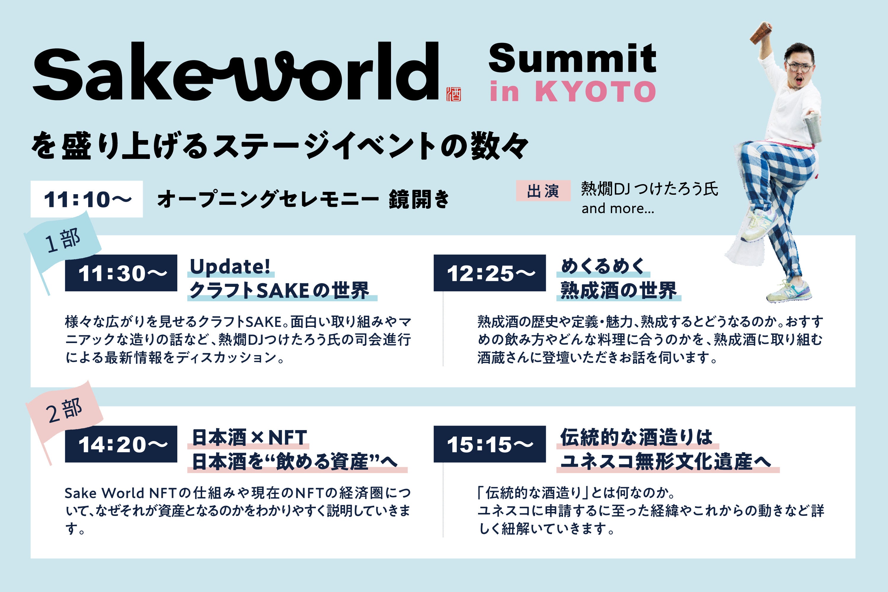最近注目されているクラフト醸造酒や熟成古酒の魅力、日本酒を「飲める資産」へと育てるNFTの仕組みや、ユネスコ無形文化遺産への登録に向けた動きが加速する「伝統的な酒づくり」についてなど、もっと日本酒が楽しくなるステージイベントをご用意しています。