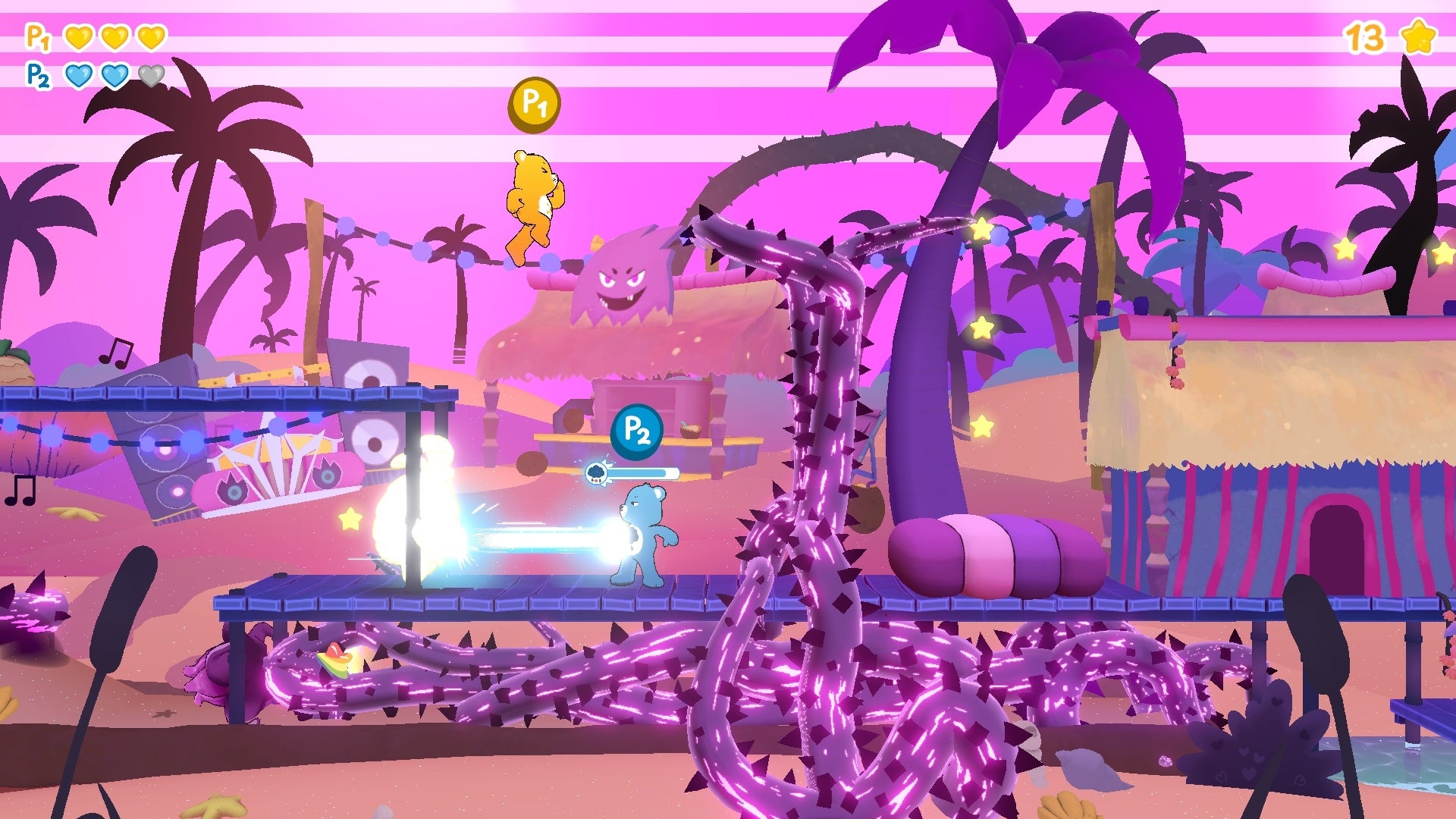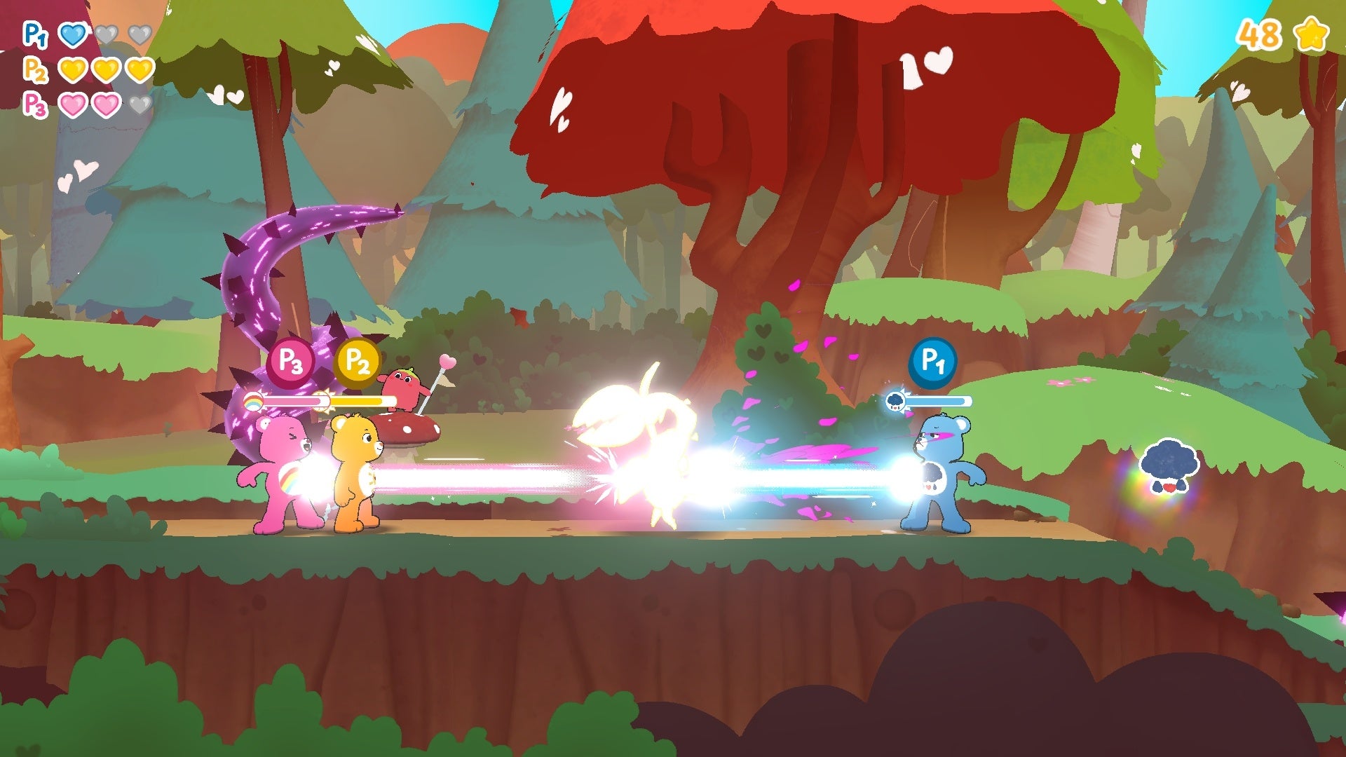 プレイアブルキャラクターは、「シェアベア」「チアベア」「ファンシャインベア」など全部で7キャラクター。 星を集めて、障害物をよけて、コレクションステッカーを集めて、お腹のバッジの力でみんなを笑顔にしていきます。5つの神秘的な世界で合計30個のステージや様々なミニゲームが楽しめます。一人で遊んだり、友だちと一緒に最大4人のローカル協力モードでプレイする事ができます! たくさんのケアリングエネルギーを集めて、シルバーライニングを救いましょう。