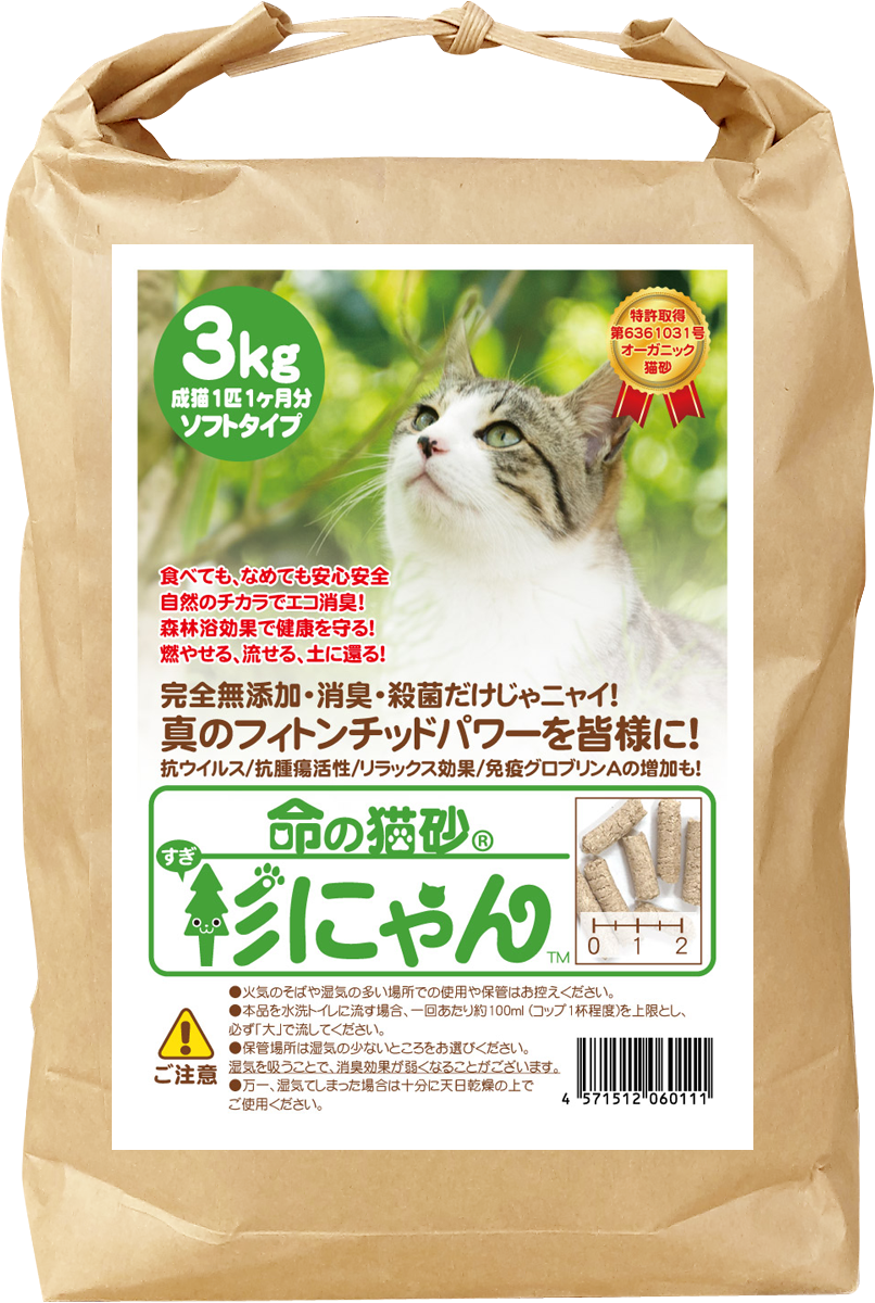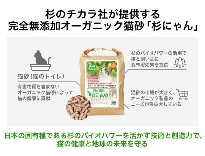 ・オーガニック猫砂「杉にゃん」は、日本固有種である「杉」の天然有効成分を生かす特許製法で開発した世界初の「猫の健康を守るオーガニック猫砂」です。