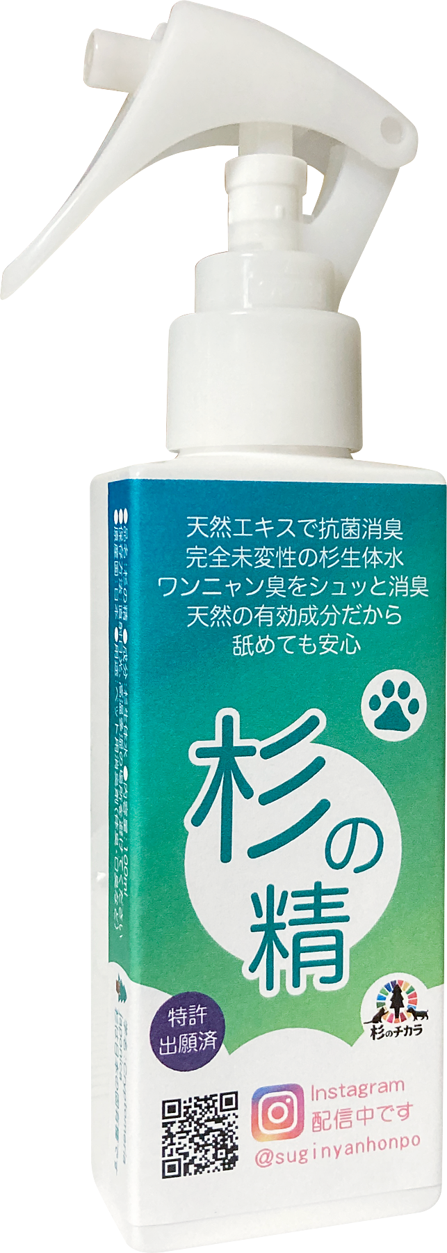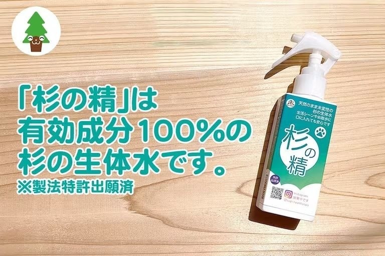 ・オーガニック消臭剤「杉の精」は、「杉にゃん」を作る際の「天日乾燥工程」で空気中に揮発させていた「杉の生体水」を特殊技術で抽出した「天然成分100%」の舐めても安心な「オーガニック消臭スプレー」です。