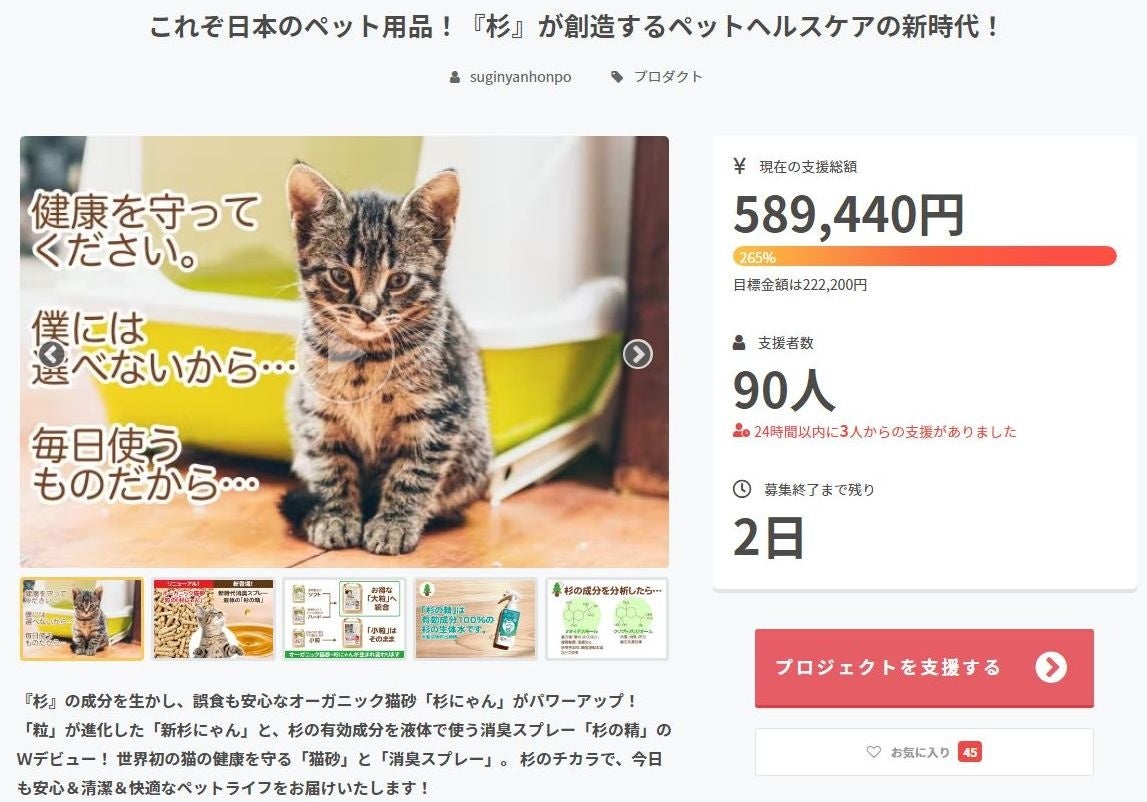 オーガニックペット用品の「杉にゃん」がクラウドファンディングで290%超え!