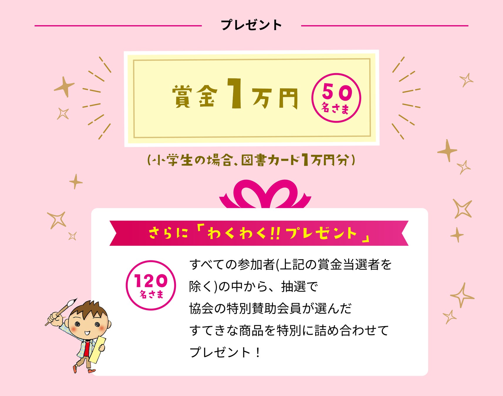 【一般の部】ベスト川柳1~3位の作品にご投票いただいた皆さまの中から、抽選で50名様に賞金1万円(小学生の場合は図書カード1万円分)を、さらにすべての応募者(上記賞金等の当選者を除く)の中から抽選で120名様に、特別賛助会員が選んだすてきな商品を詰め合わせた「わくわく!!プレゼント」をプレゼント。