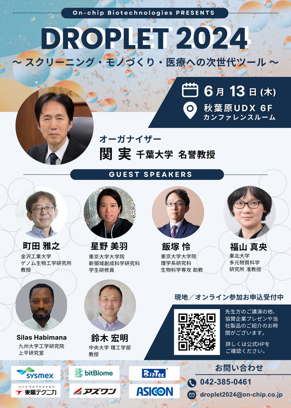 オーガナイザーに千葉大名誉教授 関実先生をお招きして、6名の先生方にドロップレットを使用した最新の研究についてご講演いただきます。