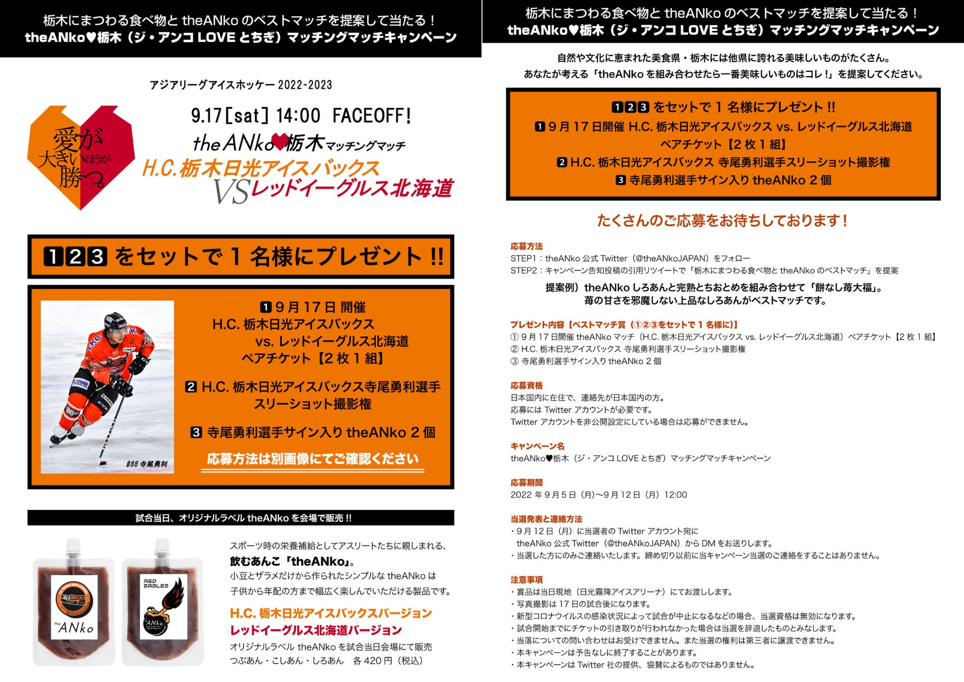 「飲むあんこ・theANko」冠協賛試合「アジアリーグアイスホッケー2022-2023 theANko❤️栃木 マッチングマッチ」が9/17(土)開催。観戦チケットが当たるキャンペーンも