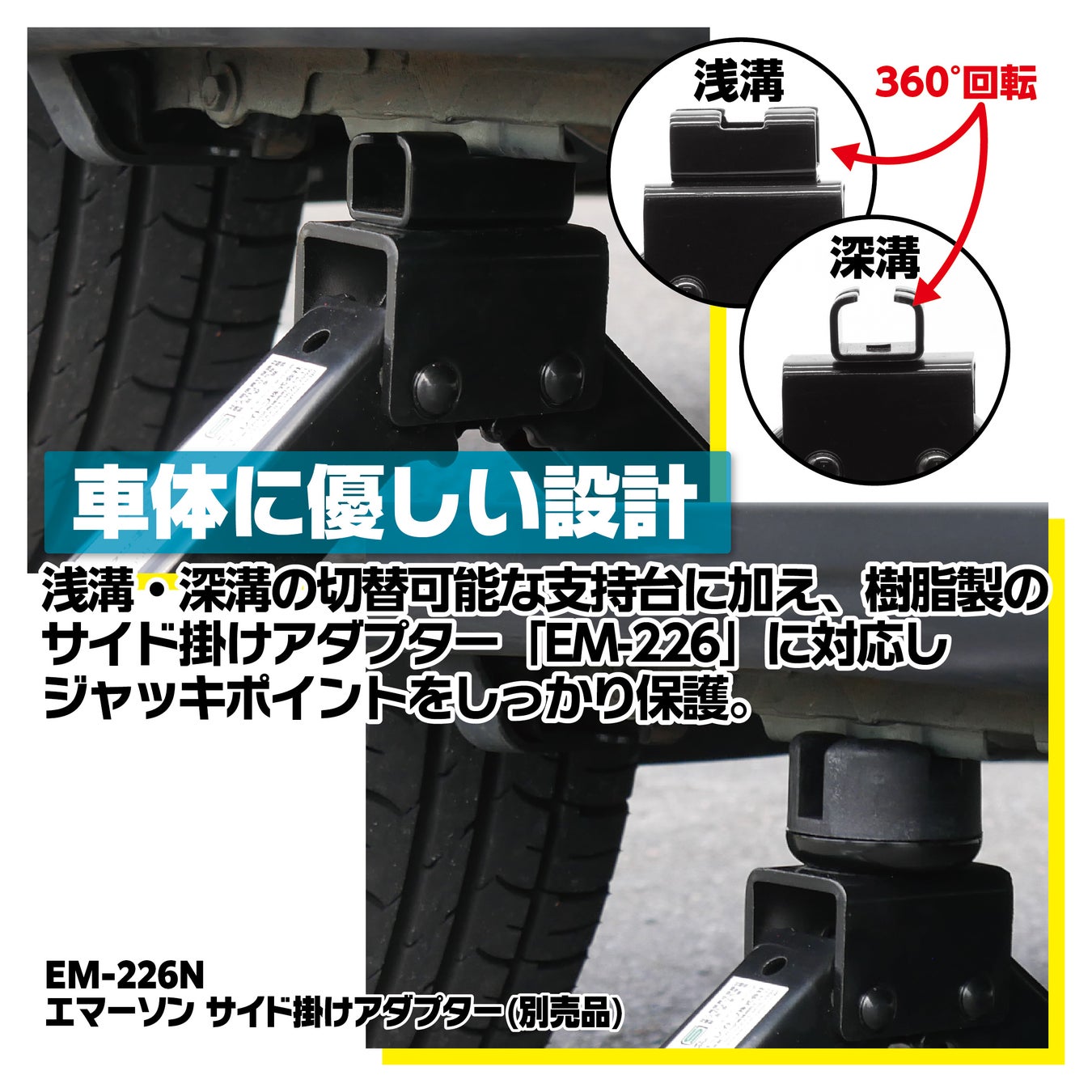 ジャッキポイントへの負担をさらに軽減したい場合は、強化樹脂製の別売アダプタ「EM226N」の併用がおすすめ。パンタグラフジャッキにセットして使うことで、車体をしっかり保持しつつ、金属接触による傷つきを防ぎます。
