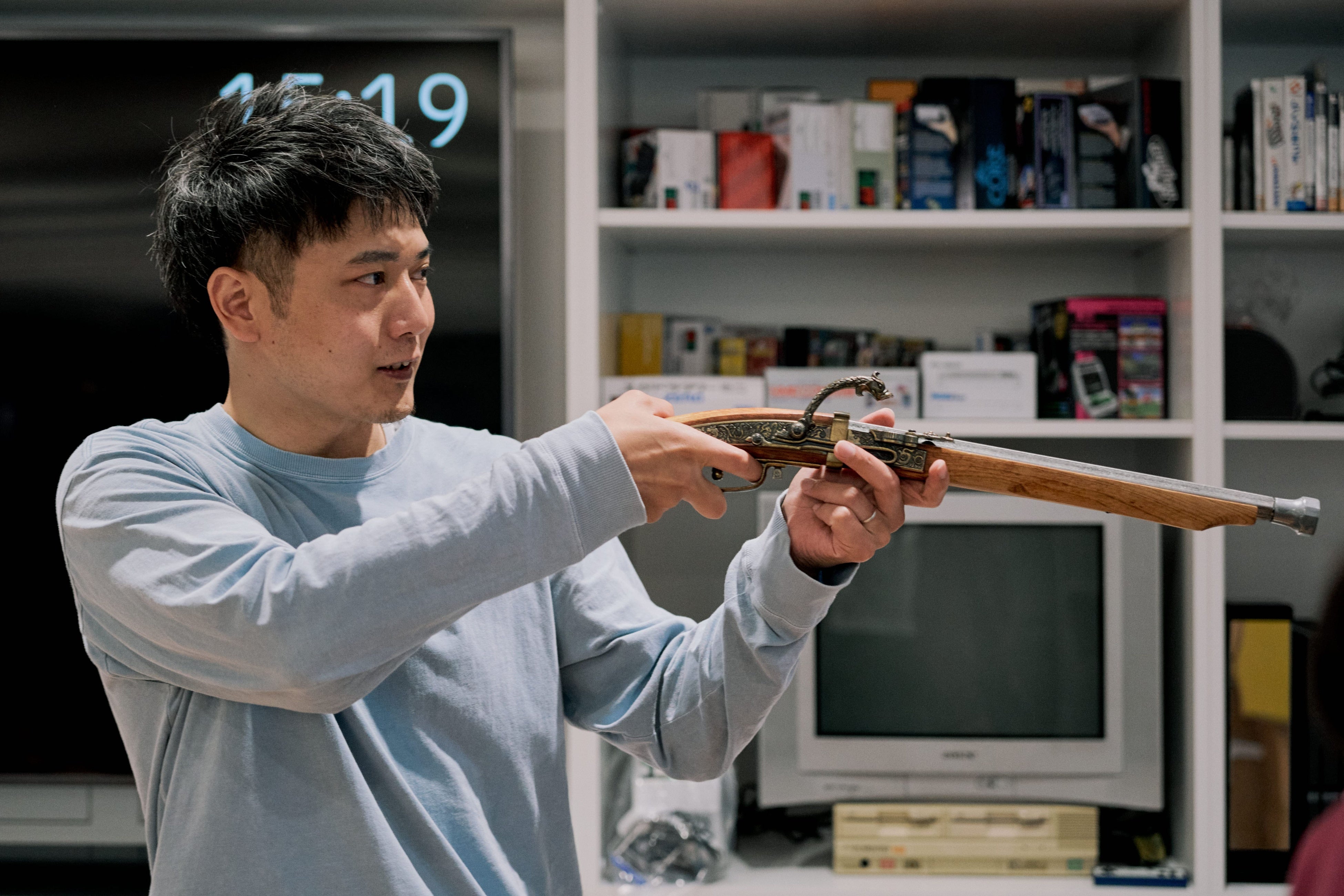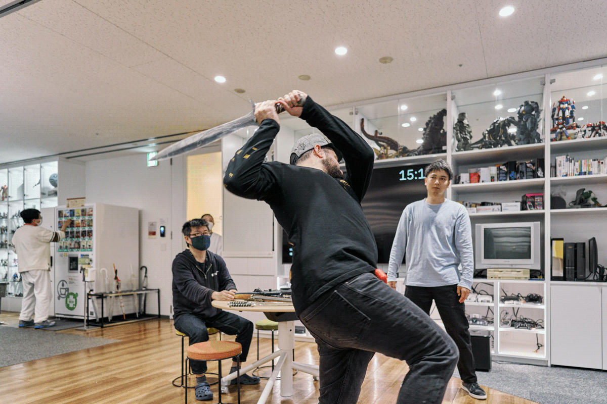 プラチナゲームズでは、具体的なモーション制作に入る前に、フィギュアや道具を使って実際に動きながらアニメーションを設計していきます。