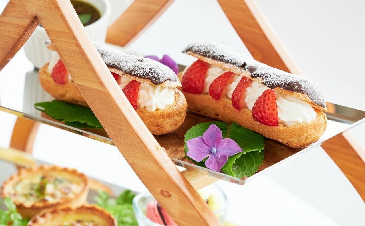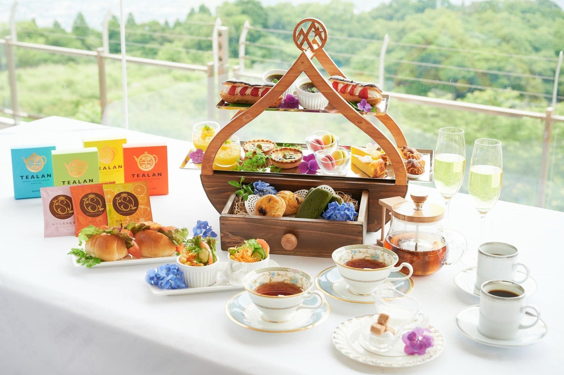 錦江湾を一望におさめる当ホテルのフレンチレストラン「Céleste」(セレステ)にて、若葉の初々しさとみずみずしく透き通った木々の新緑を感じながら、いつもよりゆっくりとティータイムを過ごしたいこの季節にぴったりの初夏のアフタヌーンティーをご用意します。オリジナルデザインの栗型の木製ティースタンドには、のどかな自然に囲まれ佇む落ち着きある当ホテルをイメージしたスイーツやセイヴォリーが並びます。さわやかな香りと強い甘味・うま味が特徴の「知覧茶」を取り入れ、季節の素材を使った11種類のお品で表現しています。数々の国内コンクール受賞歴のある新しいパティシエを迎え、新たに生まれ変わった自慢のアフタヌーンティーをお楽しみください。