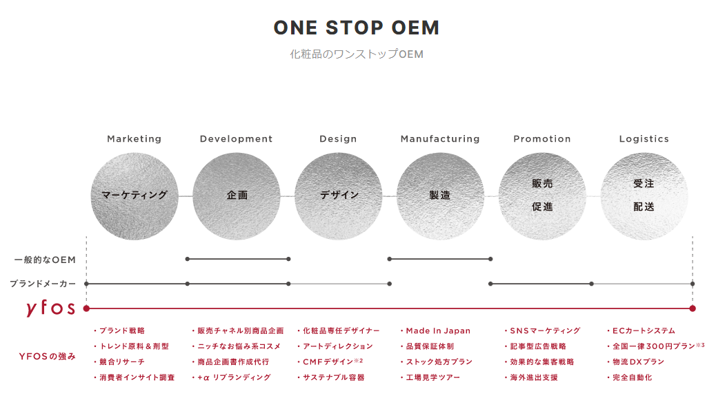 プルソワンは多数の企業の美容商品のOEMを手がけ成功へと導いてきました。物流、デザイン、ECサイト構築など、生産だけに留まらず一気通貫して成功するOEMプラットフォーム「yfos」にて数々の案件を手がける中で、唯一欠けているピースとして、インサイト発掘、ブランド・マーケティング戦略の立案がありました。