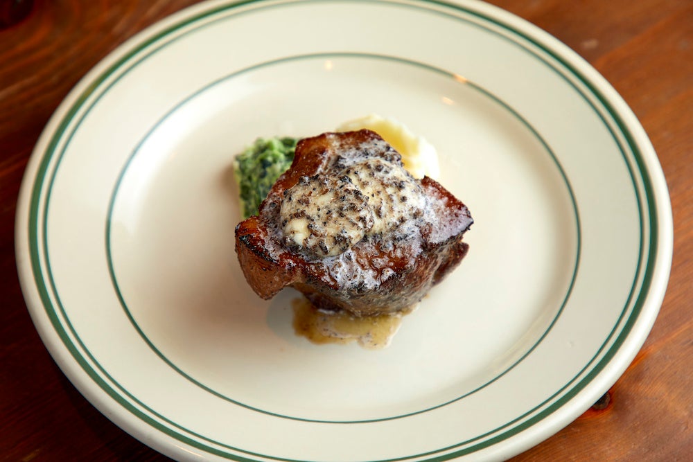 黒トリュフはポークステーキとの相性抜群。バターに香りが移ることで、ポークステーキ全体に強い黒トリュフの香りが絡み、バターの濃厚さと合わせて新しい感覚が楽しめるのでぜひ一度ご賞味を。黒トリュフバターはポークステーキの料金に+200円でトッピング可能。