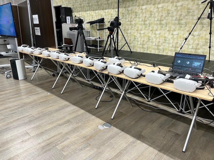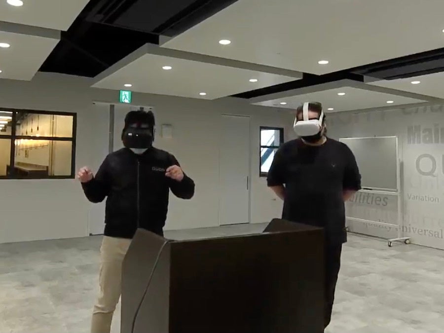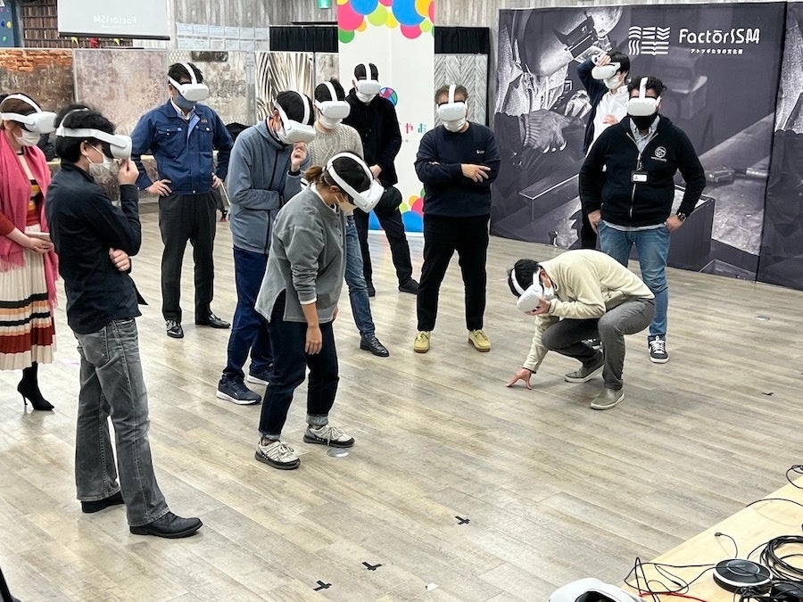 「ワープ型オープンファクトリー」とは、一体型VRヘッドセットを使用し、同時に多人数が同一のバーチャル空間にアクセス。遠隔地のまちこうばにワープし、アッと驚く工場見学を体感できます。体験者はVRヘッドセットを装着したまま会場を歩き回り、VR空間内のまちこうばを違和感なく自由に歩き回ることも可能です。