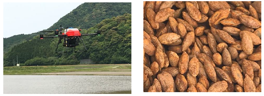 ニックス製粒製剤散布機を用いた、ドローンによる種籾鉄コーティング均一直播の実演