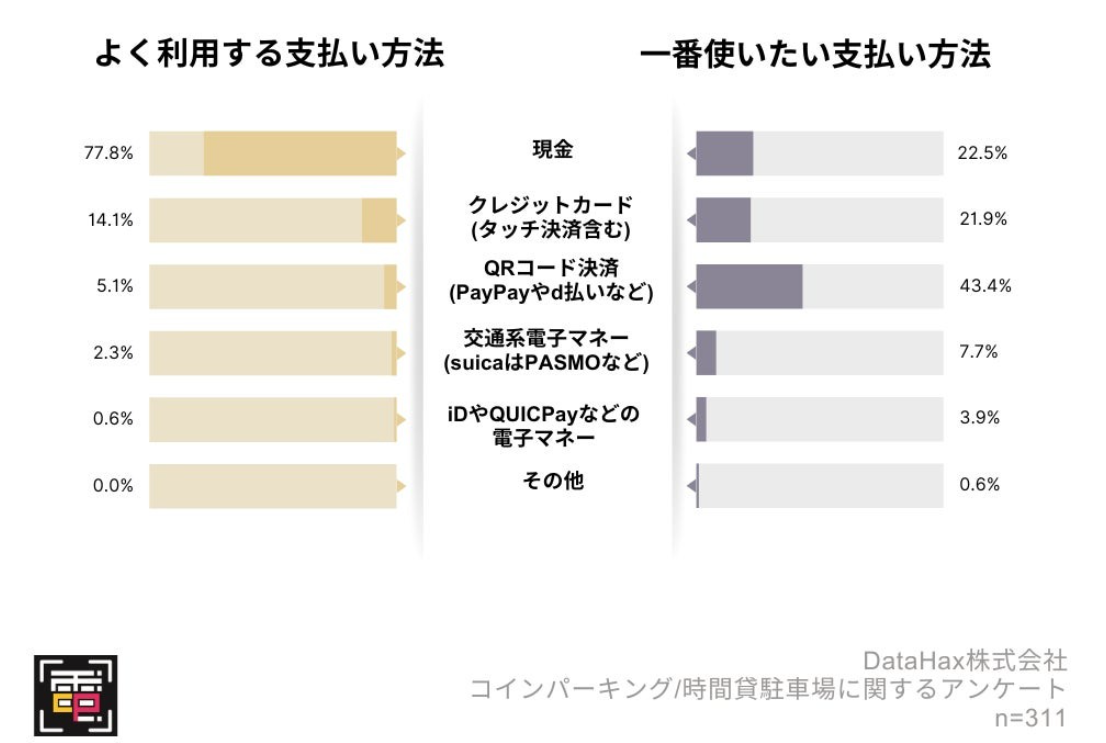 コインパーキングでもっとも利用されている決済方法は「現金」。しかし、75%以上の人がキャッシュレス決済を支持。このことから、電脳パークは「キッシュレス決済」を前提として、今回現金払い希望するユーザーに対応しました。