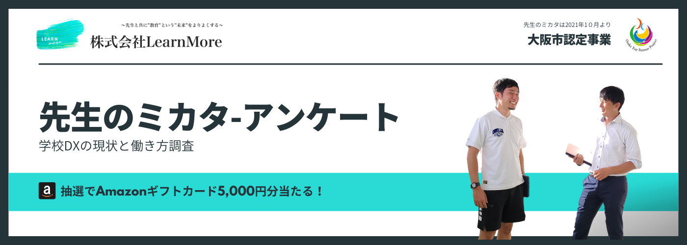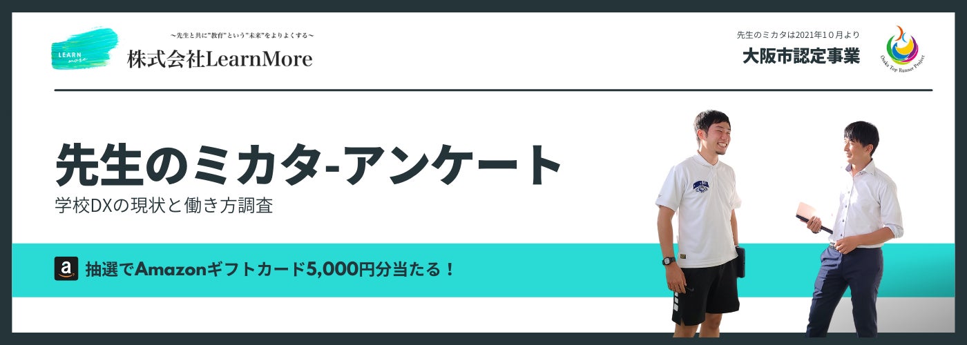 株式会社LearnMore(本社:大阪市中央区 代表取締役:坂口 雄哉)は、学校DXの現状と働き方調査のため、小学校、中学校、高等学校、特別支援学校の教員向けにアンケートを実施します。【期間:2022年2月25日〜3月4日】