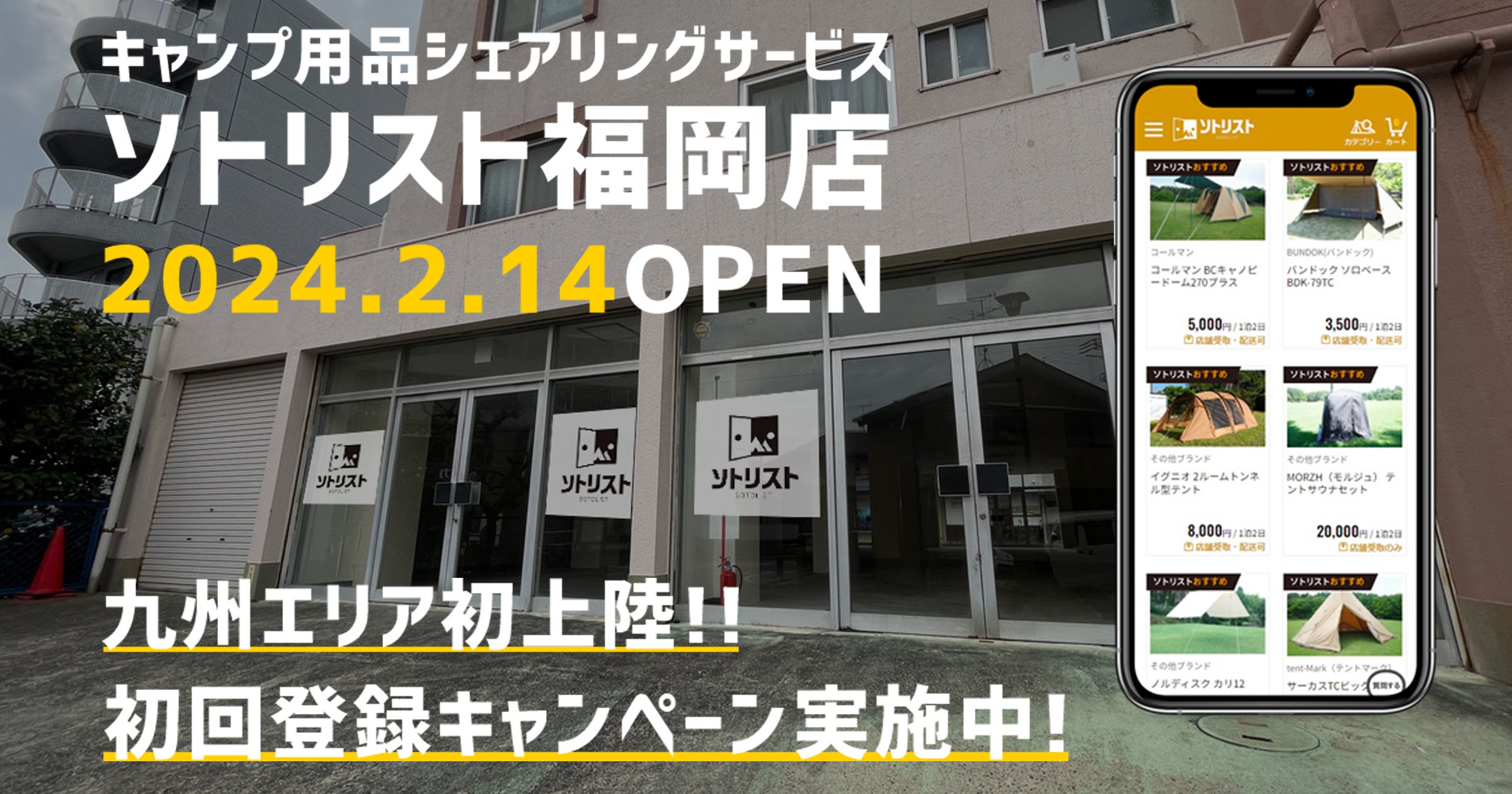 【九州エリア初上陸】使っていないキャンプ用品を無料で預けてレンタルされたら"報酬がもらえる"シェアリングサービス「ソトリスト福岡店」2月14日オープン!