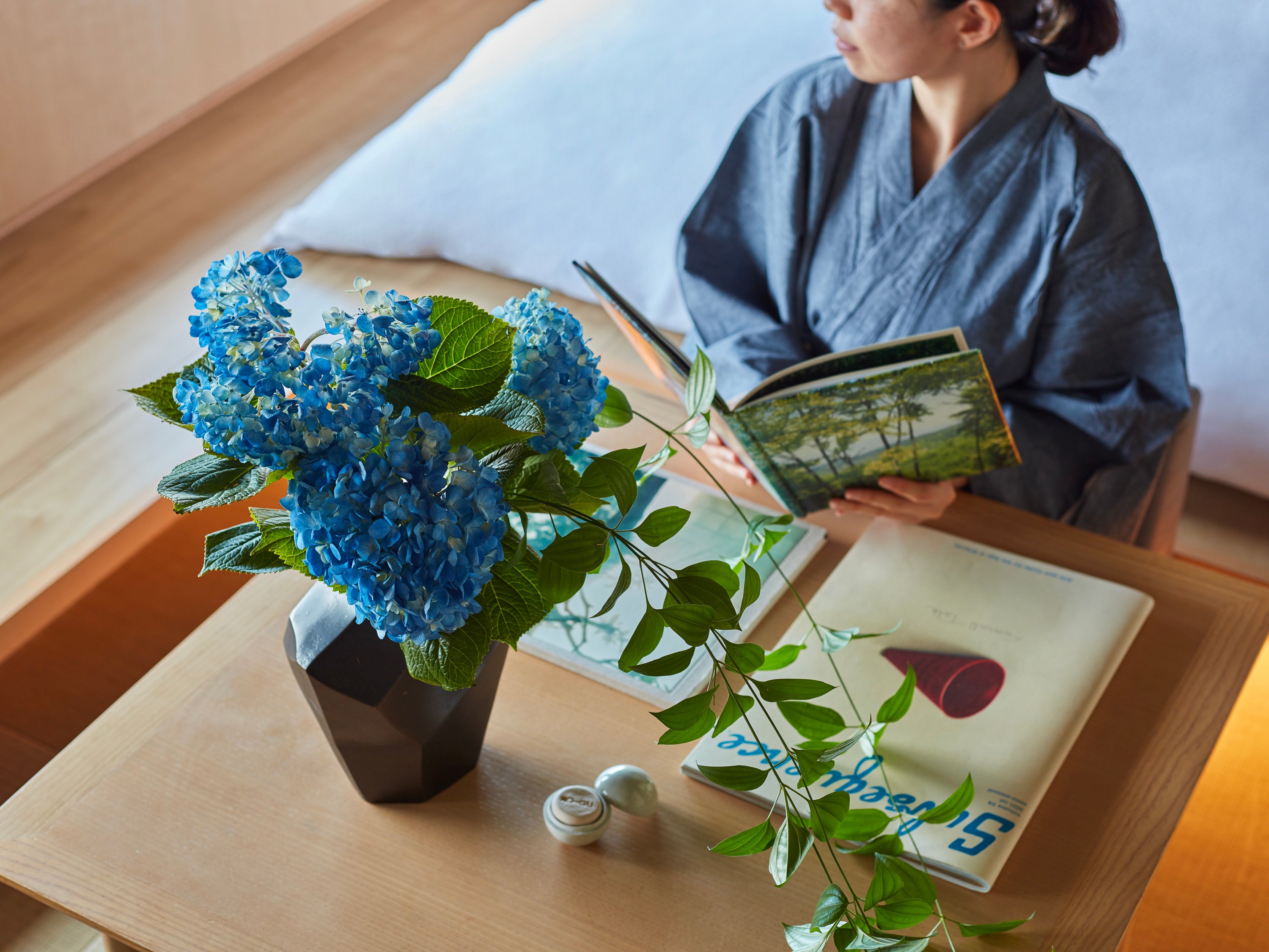 紫陽花を中心に、初夏の梅雨をイメージした生花を客室に設えます。また、湯上りの読書にぴったりな雑誌や写真集など約3冊をご用意。客室にてお楽しみください。