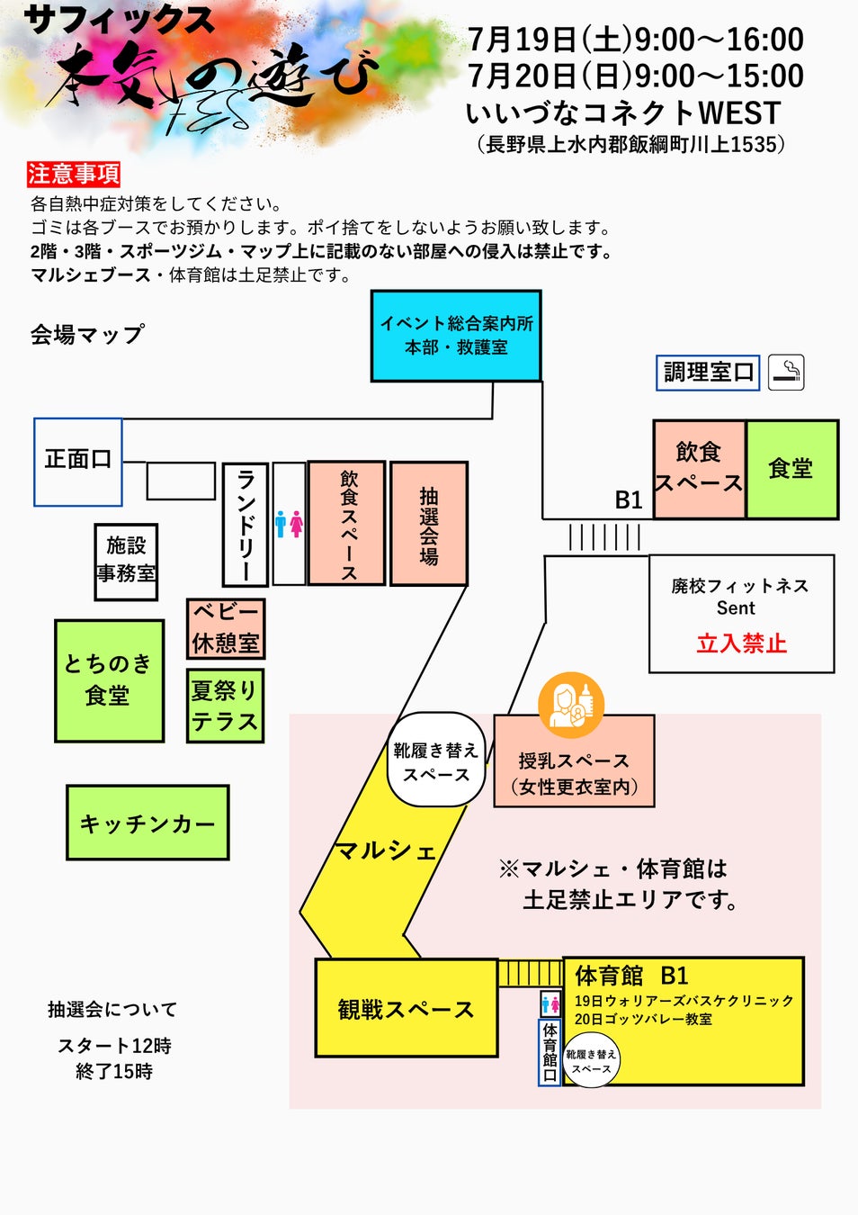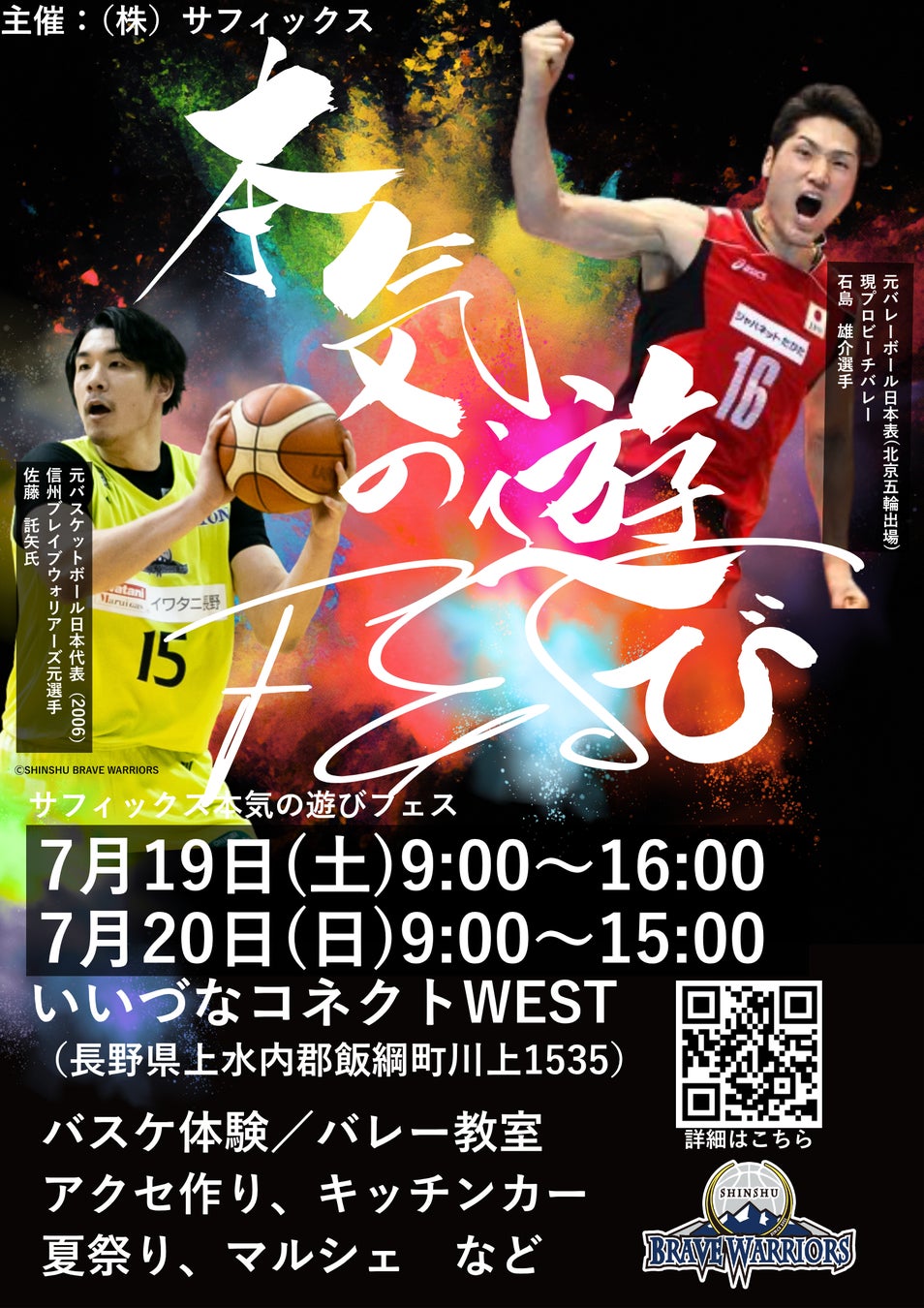 本イベントは7月19日・20日の2日間に渡り開催いたします。メインイベントとして、19日は信州ブレイブウォリアーズアカデミーさんによるバスケットボールクリニック、20日は元日本代表バレーボール選手の石島雄介(通称、ゴッツ)さんと信州ブリリアントアリーズアカデミーさんによるバレーボール教室を開催いたします。