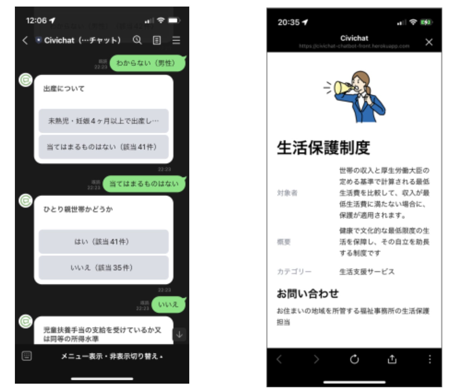 Civichatは、LINEなどからチャットボット形式で自分の状況を入力することで、利用できる制度を推薦してくれる。