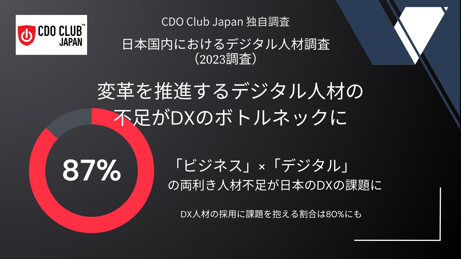 本調査の結果を受けて、当団体としては現時点での多くの企業のDXの推進におけるボトルネックが、 単なるテクノロジーやAI・データサイエンスのエキスパートではなく、ビジネスとテクノロジーの双方の理解をも つ「両利き人材の不足である点」が最も大きな要因である点が確認できた。 それは、紛れもなく現在主要な企業で活躍するCDO(最高データ・デジタル責任者)が有する経験や資質で あり、このような人材をより社会的に増やしていくことが日本全体のデジタル化の推進に重要であることが再確認された。