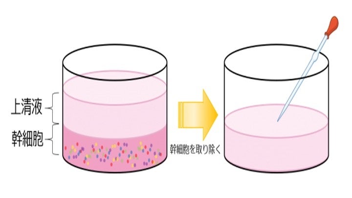 幹細胞を培養する過程の培養液から、遠心分離と濾過をして細胞や不純物を取り除いた上澄みの部分が幹細胞培養上清液です。この上清液には、培養液中に幹細胞が放出したサイトカイン(成長因子)が多く含まれますが、幹細胞そのものは含まれていません。脂肪由来の幹細胞培養上清液には、有効なサイトカインが40種類以上含まれていることが知られています。