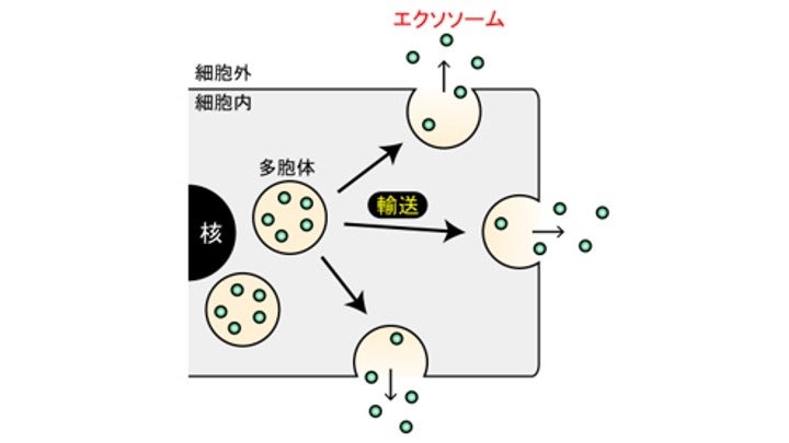エクソソームは、細胞の核の中にあるmRNAやmiRNAを含む、30~150nmのサイズとなる顆粒状の物質で、細胞小胞(Extracellular vesicle)の一種です。エクソソームの表面は細胞膜由来の脂質、タンパク質を含み、内部には細胞核の中にある情報(mRNAやmiRNA、DNA)を含んでいます。エクソソームは他の細胞に情報を伝達するために細胞膜を破って放出され、別の細胞に取り込まれ、細胞間のコミュニケーションをすると言われています。そのエクソソームの作用が、細胞の分化・老化や免疫系の制御に関与している事がわかり、さまざまな治療に役立つとして基礎研究がおこなわれています。
