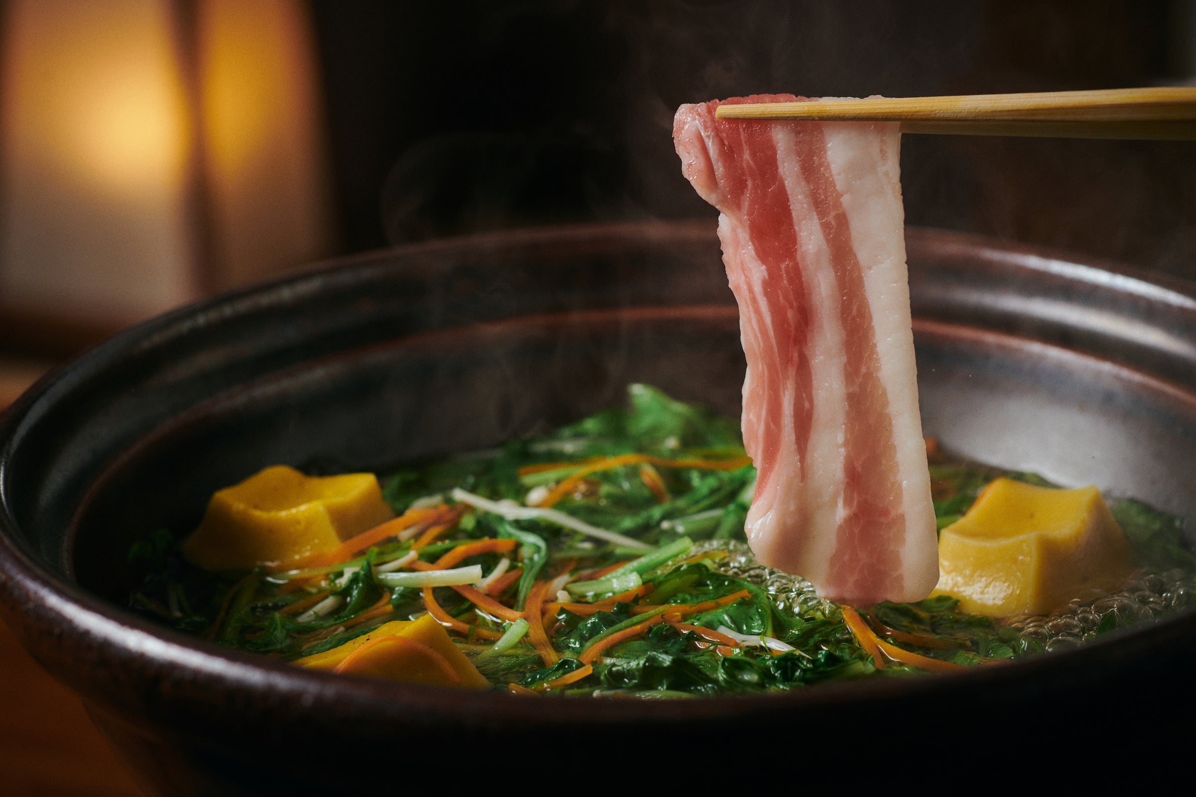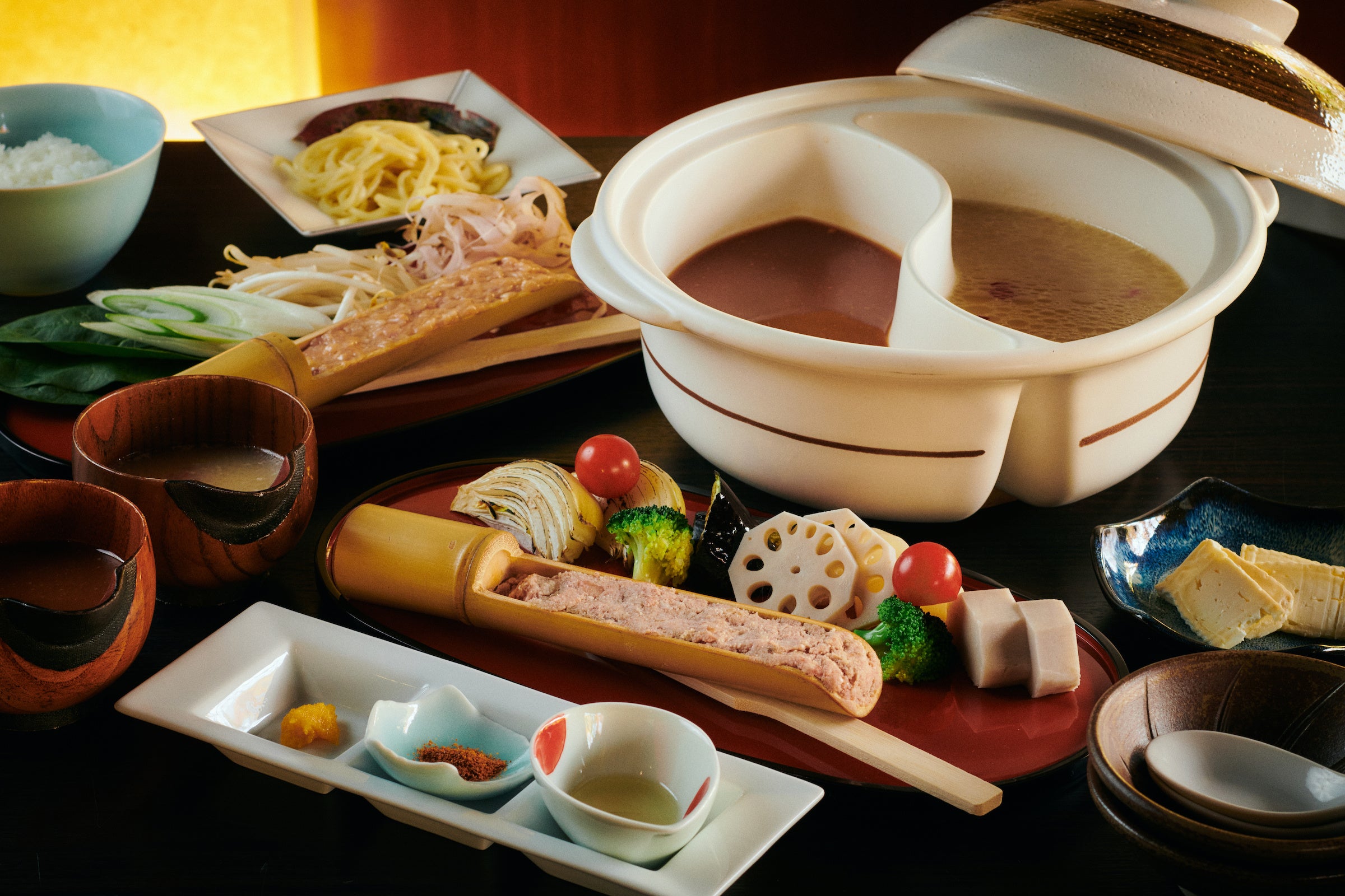 鍋の種類は、トマト鍋やしゃぶしゃぶ、すき焼きから火鍋・薬膳鍋までバラエティーに富んでおり、食材は肥後赤鷄、味彩牛、小国舞茸など地産の滋養ある食材をふんだんに使っています。