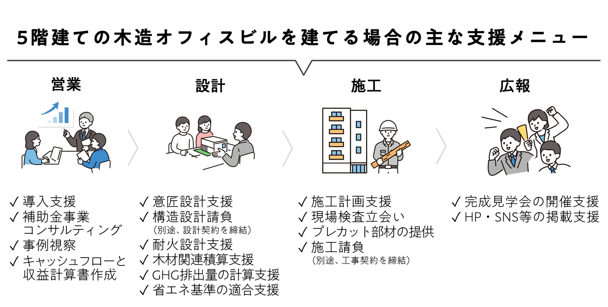 パートナー企業の社内部署立ち上げや営業といった案件創出フェーズから、設計や施工、今後対応が求められるGHG排出量の計算、さらに完成後の広報活動など木造建築に係る全工程を支援することが可能です。建物の規模や用途を問わず個々のニーズに応じて適材適所で支援いたします。
