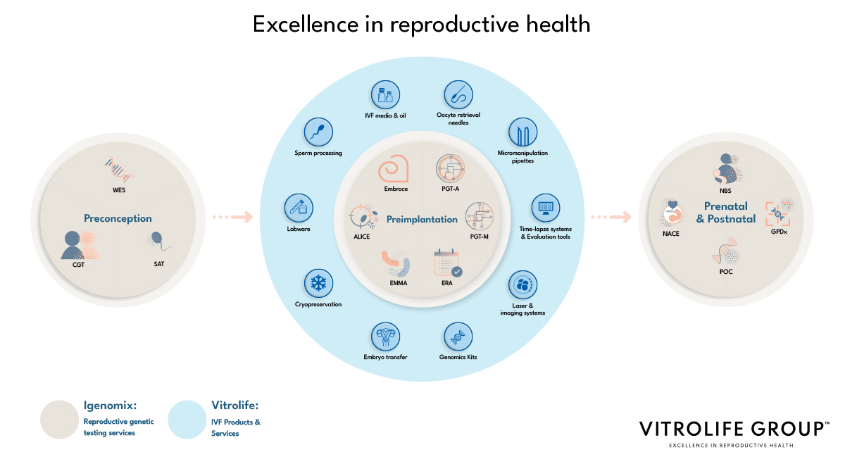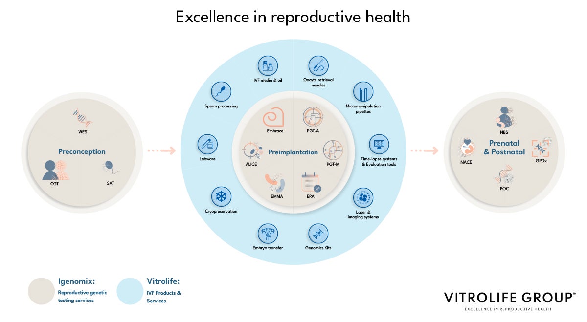 アイジェノミクス社の生殖遺伝子検査技術とヴィトロライフ社の医療機器ラインナップがワールドワイドな規模で連携し、赤ちゃんが欲しいと願う方々に寄り添い、妊娠前から出産後までの道のりをサポートいたします。