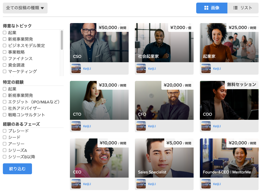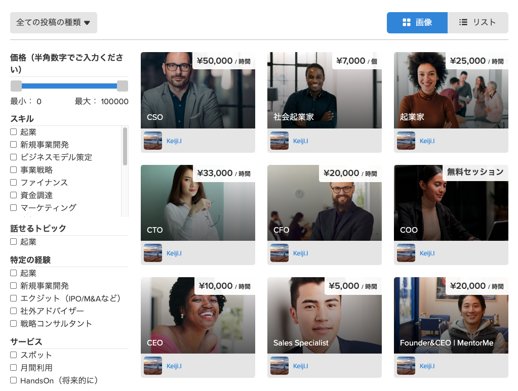 現在はスタッフが要件定義から候補者選抜までお手伝いする「サポートプラン(仮)」のみの提供ですが、本マーケットプレースでは、自分で気になるメンターを見つけ、相談することができます。