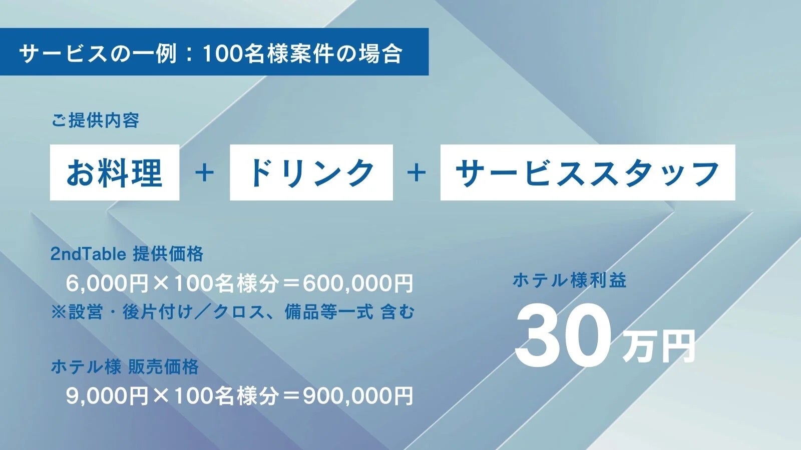 また、当サービスの利用によって宴会単体の収益を得るだけではなく、ホテルの長期かつ包括的な収益アップとブランディングにも効果的であるとセカンドテーブルは考えます。