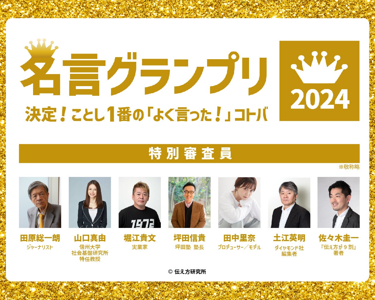 テレビ・SNS・雑誌などから年間300以上の名言を集める伝え方研究所(※)は、このほど「名言グランプリ2024」の開催を決定し、ノミネート10選を発表しました。2017年以来、第8回目となる今年は、ジャーナリストの田原総一朗氏ほか、計8名による審査が行われます。その年に生まれた「その年、もっとも素晴らしかった名言No.1」を決定し、伝え方研究所の公式webサイトなどで12月12日(木)に結果を発表する予定です。