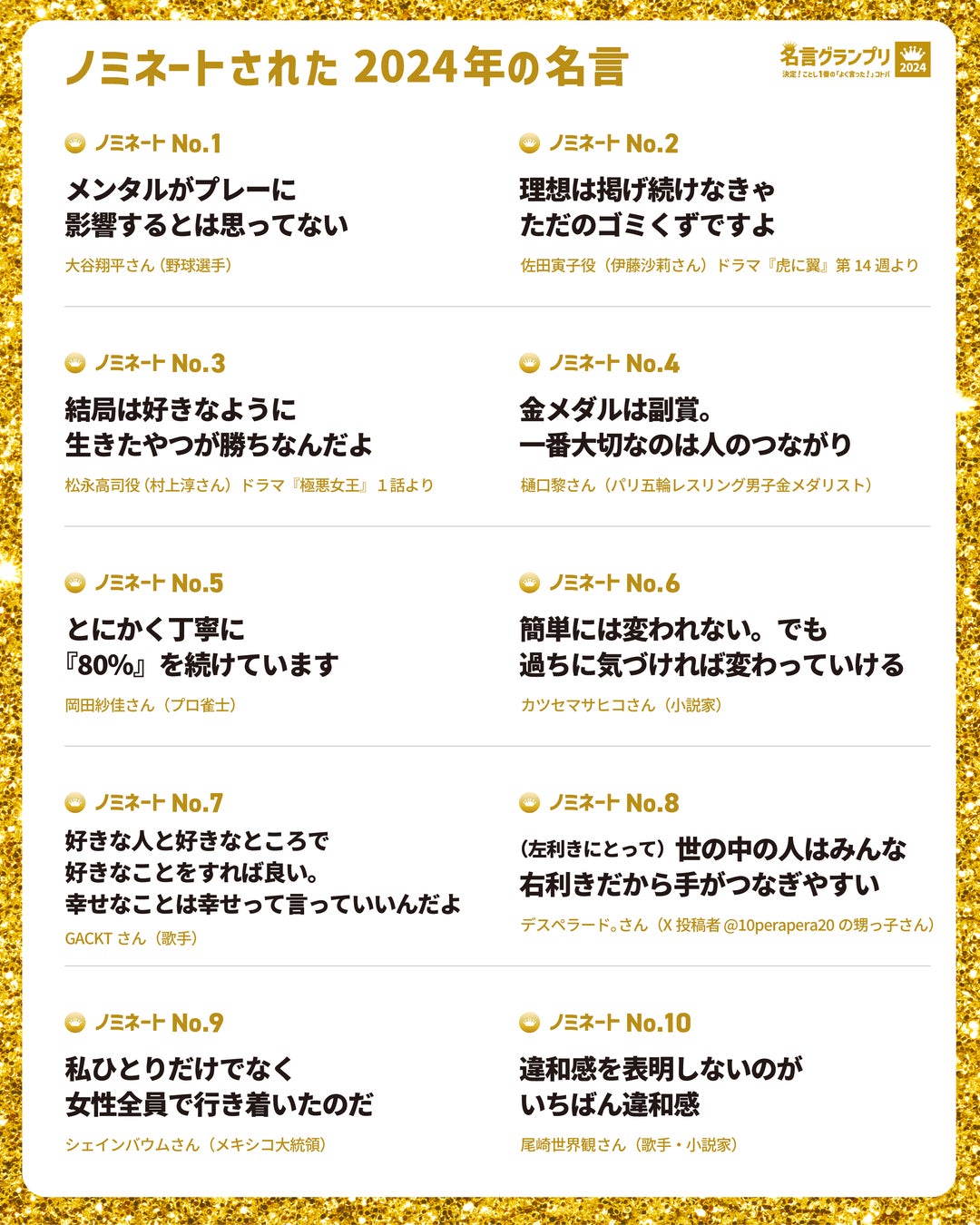 大谷翔平選手「メンタルがプレーに影響するとは思ってない」ほか、『虎に翼』や、パリ五輪金メダリストの名言がノミネート!2024年「よく言った!」コトバは?第8回「名言グランプリ」開催!