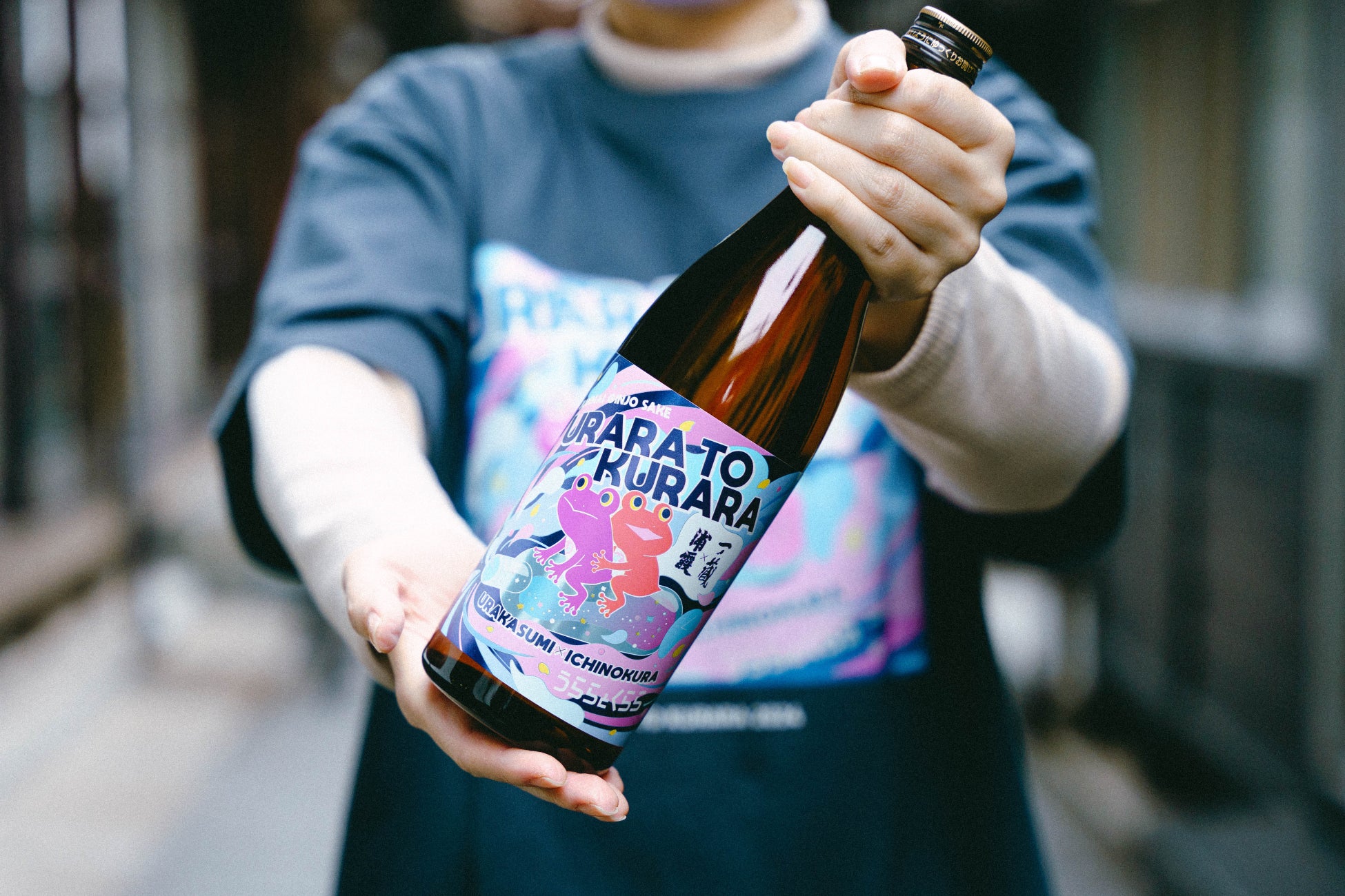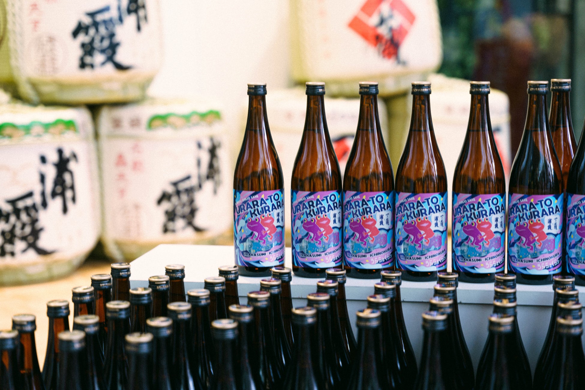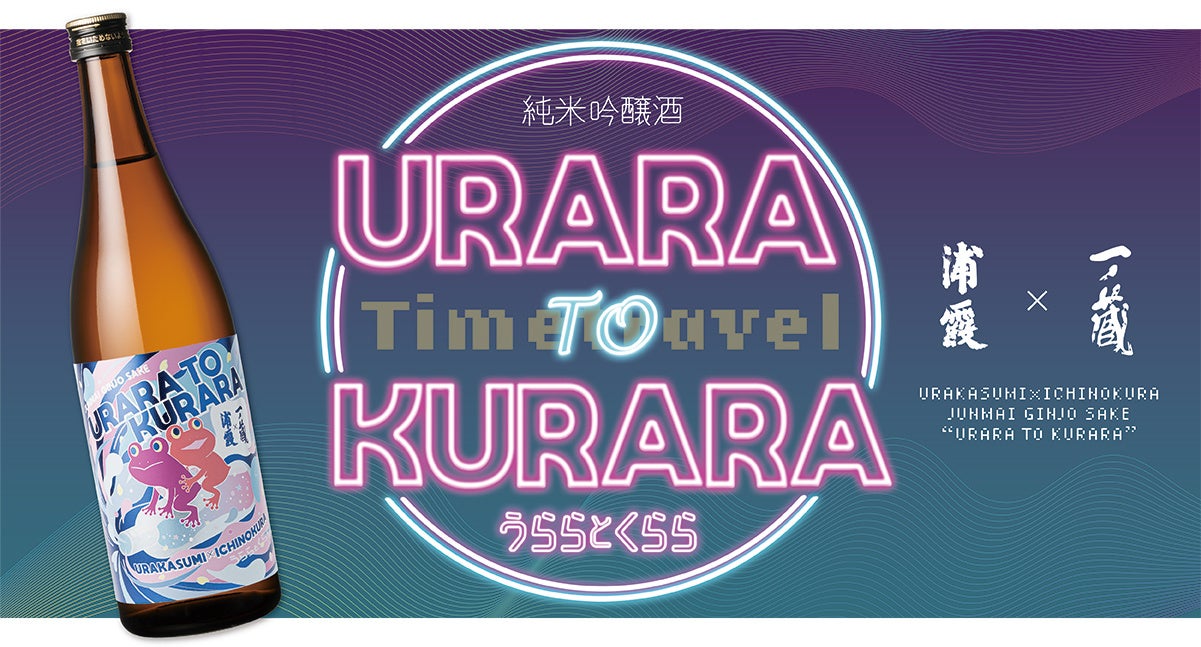 今年のラベルデザインは、企画コンセプトの「変える(=カエル)」をモチーフとしたキャラクター「うららとくらら(浦霞の「うら」と一ノ蔵の「くら」から命名)」が、両蔵がこれまで培ってきた技術や経験のかけらを瓶の中に集めながら1980年代を「タイムトラベル」する様子をポップでノスタルジックな世界観で表現しました。