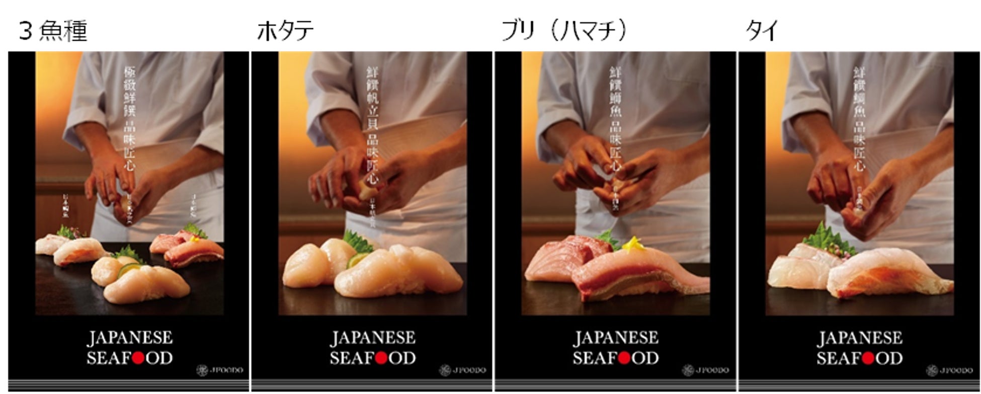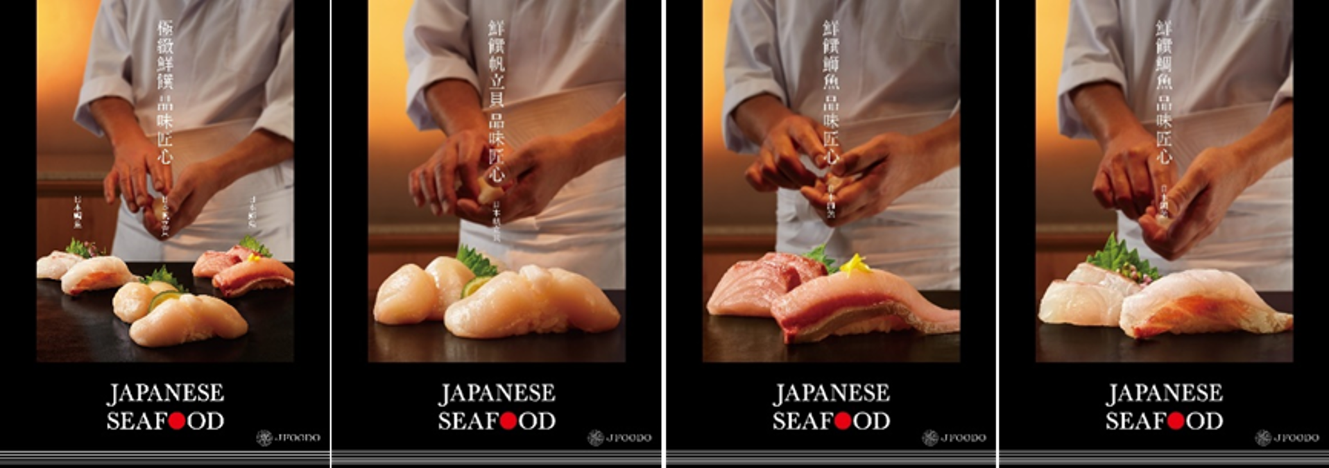 本プロモーションは、主に富裕層をターゲットとし、日本の高品質な水産物をより多くの方に身近に感じていただくことで、3 魚種の消費拡大を目指します。「日本人の丁寧さが生み出す新鮮で美しい海の幸」を訴求するため、「極緻鮮饌 品味匠心(日本語訳:極上の新鮮なごちそう 匠の技をご賞味あれ)」をキャッチコピーとして発信します。また、台湾の16 店舗で3 魚種の魅力を伝えるためにPOP を設置、うち10 店舗で3 魚種が味わえる特別メニューを開発し、現地の人気インフルエンサーが取材、発信をします。