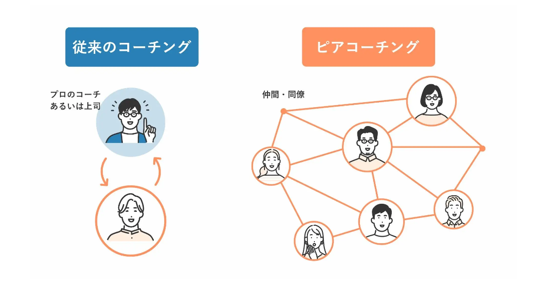 通常「コーチング」とは、対話を通じて相手に気づきを与え、自発的な行動を促し、目標達成・課題解決を支援するコミュニケーションで、上司やプロとの縦の関係において実施され、1on1などで活用されるものです。一方、ピアコーチングとは、直接の力関係のない横のつながり(ピア)同士が相互にコーチングをしあうことを言います。