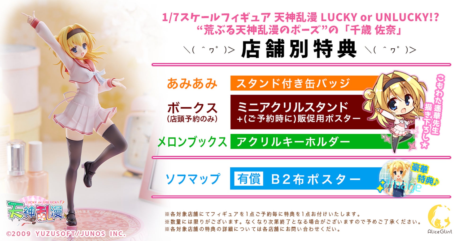 株式会社アリスグリントは、大人気ゲーム『天神乱漫 LUCKY or UNLUCKY!?』より、「千歳佐奈」を1/7スケールフィギュア化し、2022年6月8日(水)より予約受付を開始いたしました。