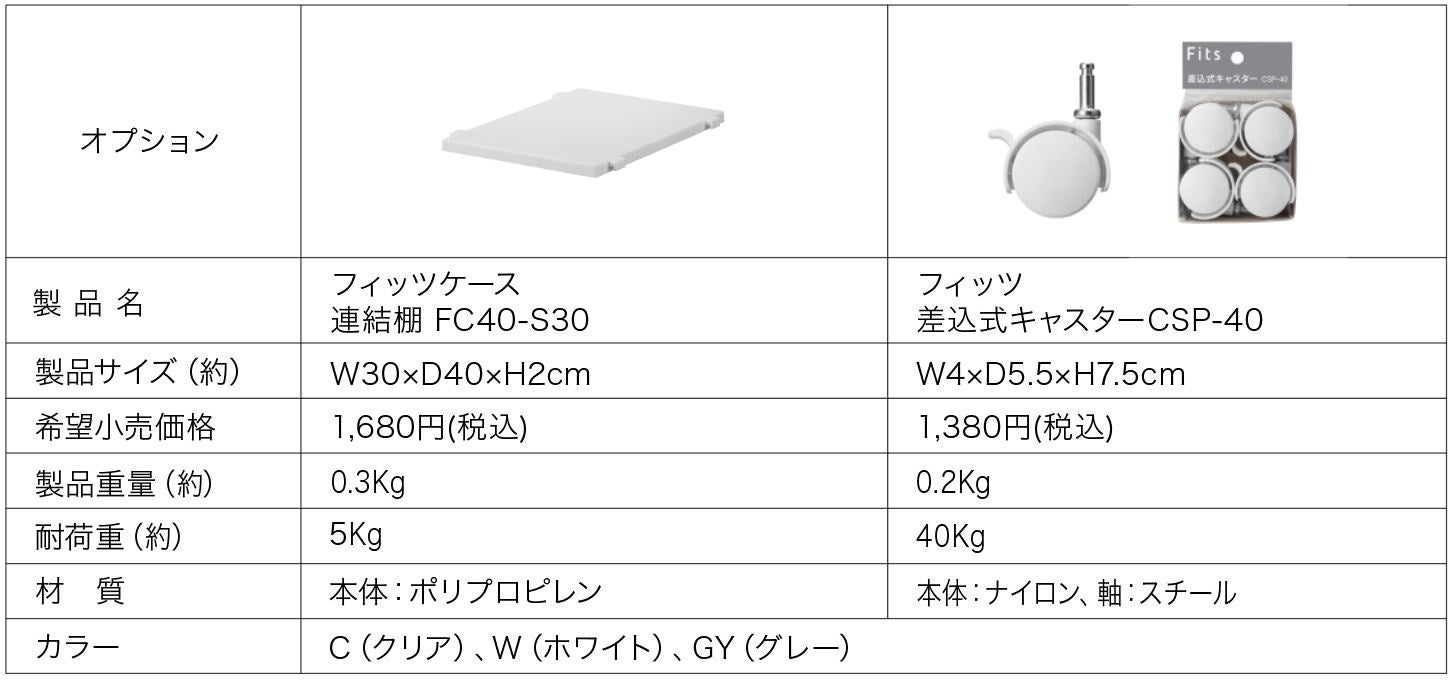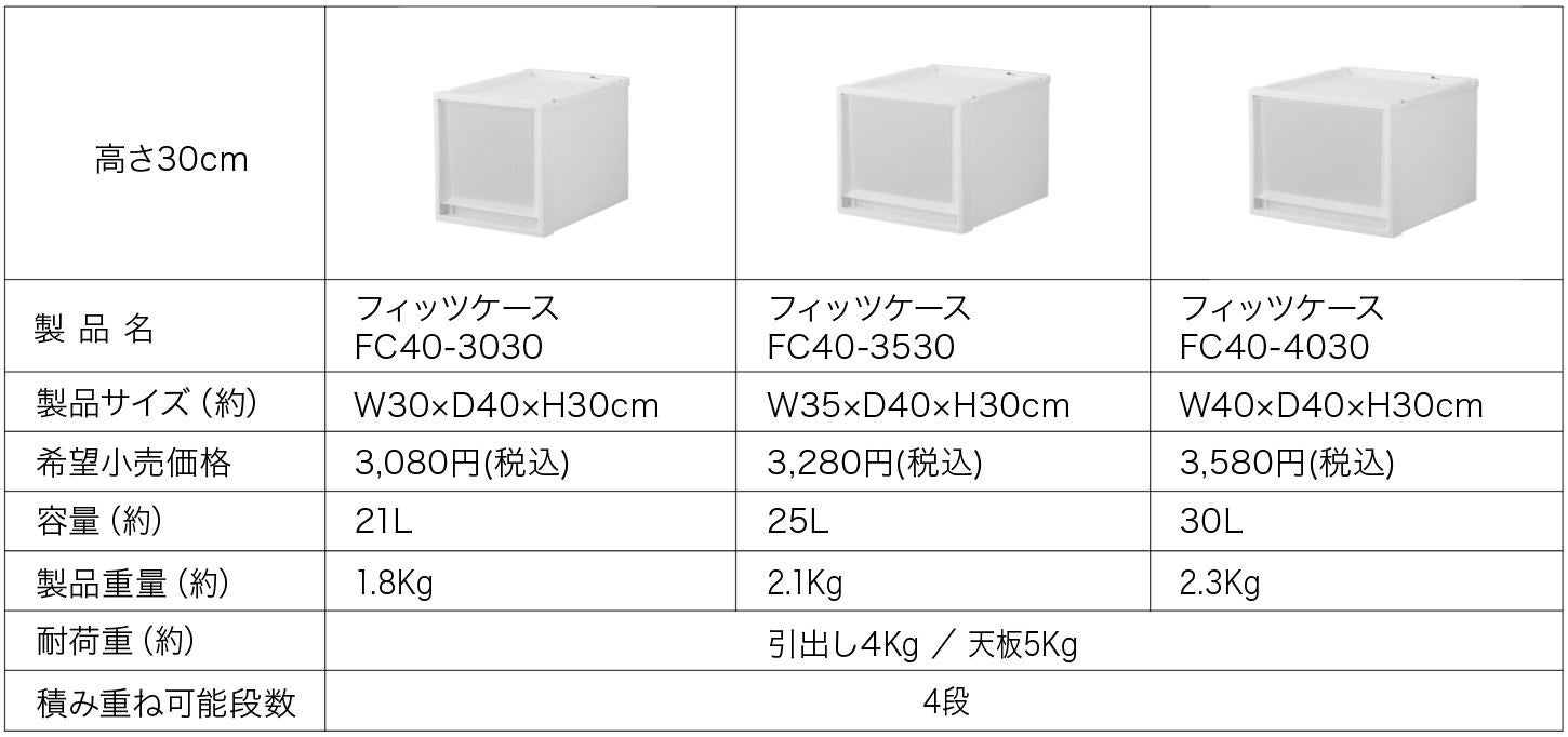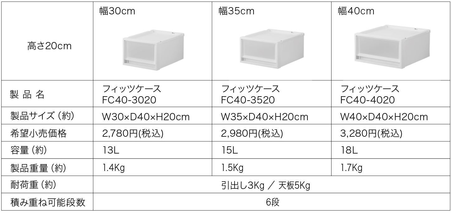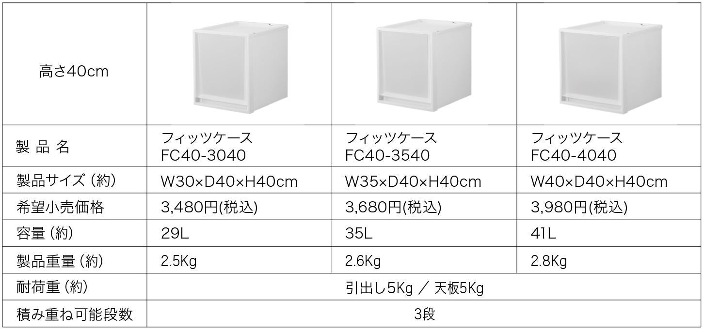 フィッツシリーズは1986年の発売より様々な住宅環境や用途に合わせて、皆様の生活にフィットする収納用品を提案してまいりました。新モデルの「FC40」シリーズは近年の住宅デザインや住空間、ライフスタイルの多様化に合わせて開発された、使用シーンを選ばない奥行40cmの引出し収納ケースです。
