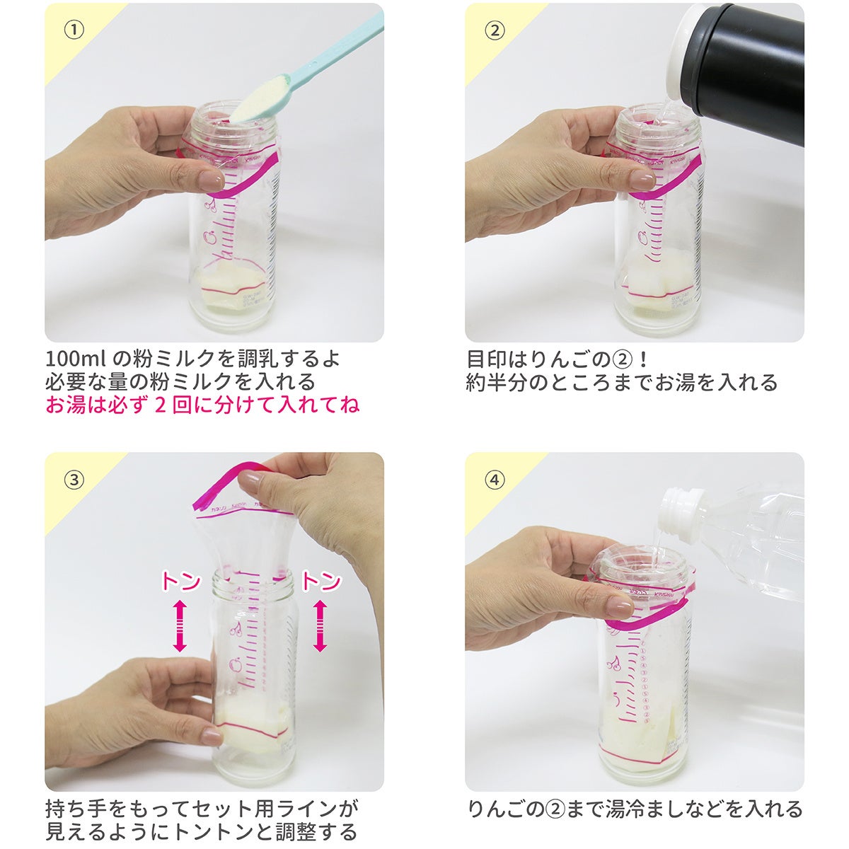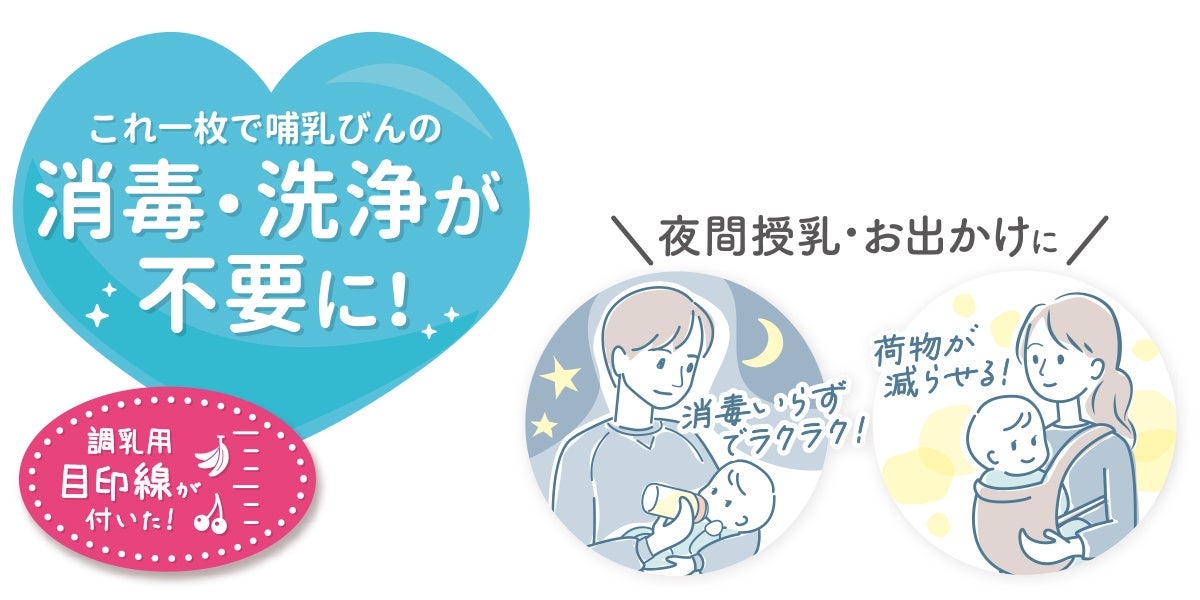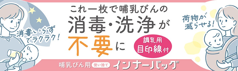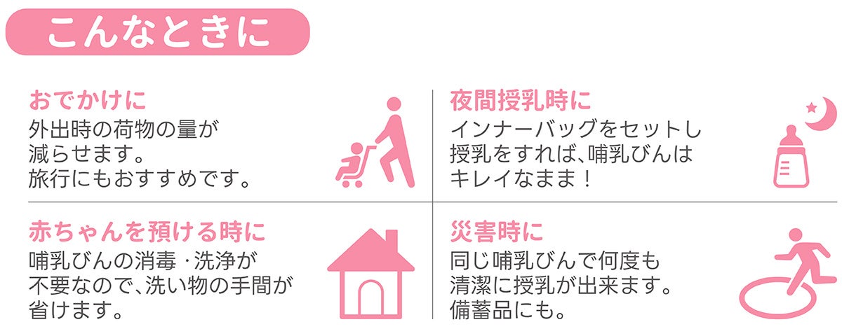 「哺乳びん用インナーバッグ」は、外出時の荷物の軽減や日常・夜間授乳時、また防災備蓄など家庭内外で活用できる便利なアイテムです。授乳後は、インナーバッグ本体を取り替えるだけで哺乳びん本体の消毒・洗浄は不要です。