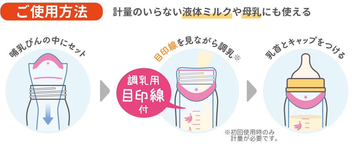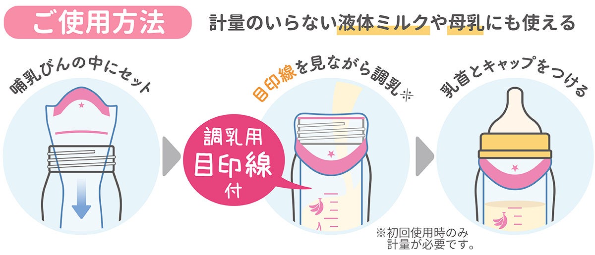最初に1回だけ計量し、目印線をお手持ちの哺乳びん用めもりにカスタマイズします。