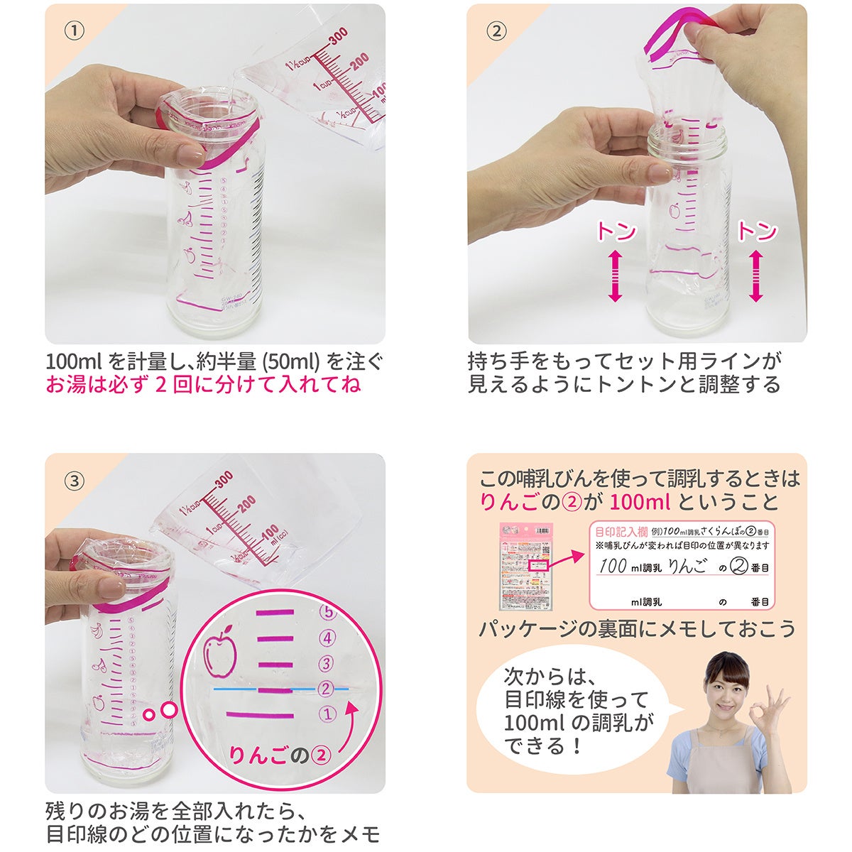 哺乳びんのカタチは様々で、めもりの位置も違います。各哺乳びんのめもりのかわりに本製品の目印線をめもりとして使用して調乳することができます。