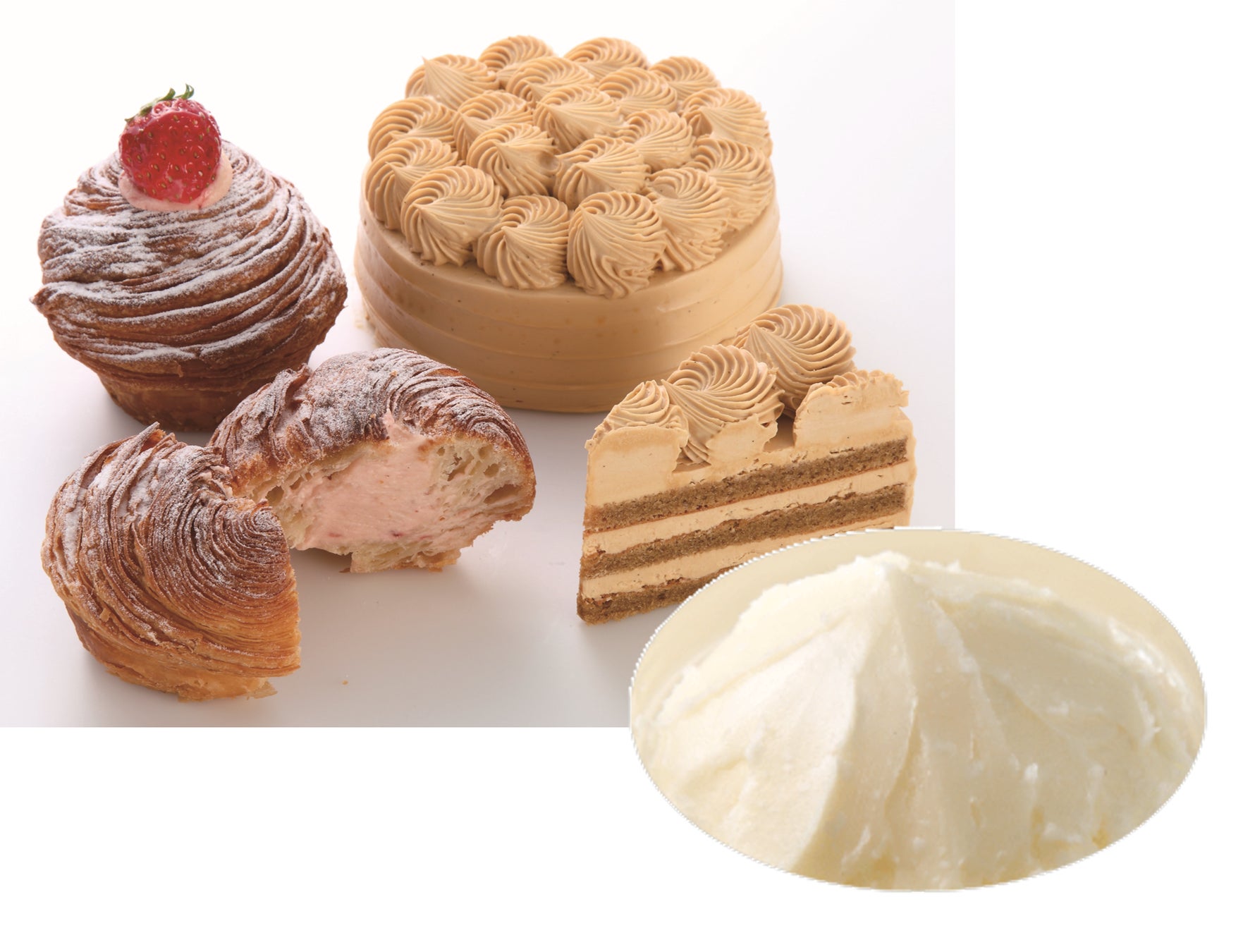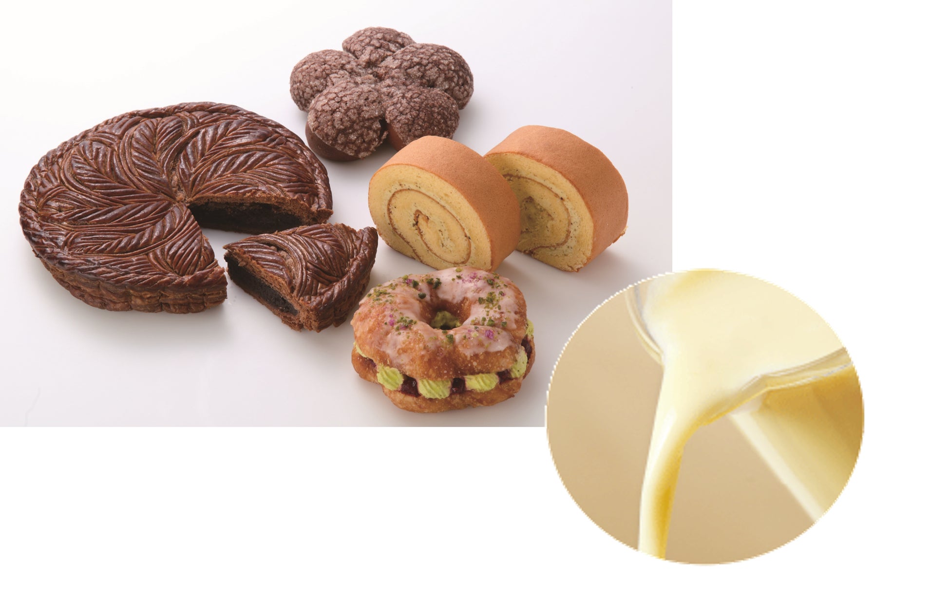 パン生地に練り込むことで安定性が向上し品質が安定するため、生産ロス削減に貢献します。また、フィリングやケーキスポンジに使用すると風味や口どけが向上する等、おいしさと環境配慮を両立します。