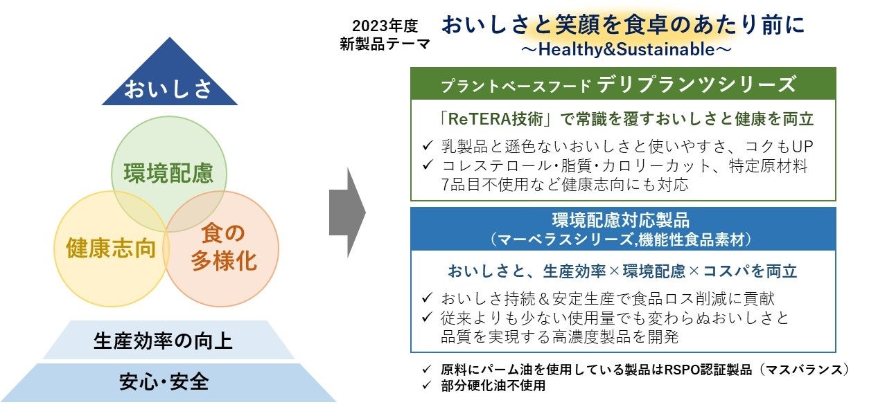 2023年度新製品は、食の多様化や環境配慮の観点からニーズが高まっている「デリプランツ」シリーズと、食品ロス削減に貢献する「マーベラス」シリーズを拡充します。また、トランス脂肪酸低減に向けて部分硬化油の削減や、持続可能なパーム油に貢献するRSPO認証製品の拡大にも引き続き取り組んでまいります。