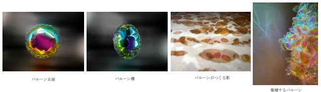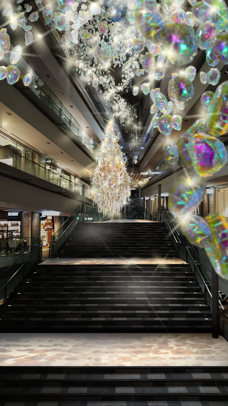 クリスマスイルミネーションには合計約1万4,000 個(天井部約6,000個、ツリー部:約8,000個)のバルーンを使用。オーロラのように見える積層偏向フィルムから作られたバルーンは、「DAISY BALLOON」とバルーンメーカーが共同開発したオリジナル素材。光の屈折により多重反射する事で、自発光しているかの様に光り輝きます。素材を一つひとつ手作業で成形しているため、形と大きさが一つとして同じものはないスペシャルなバルーンから構成されたイルミネーションです。