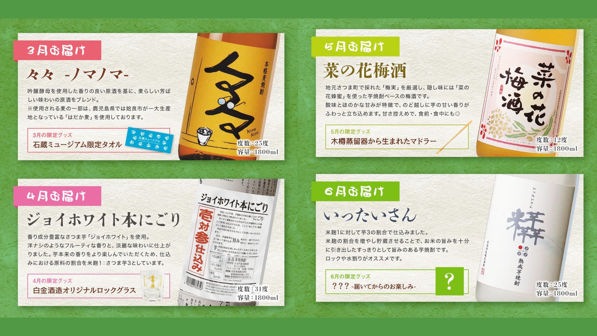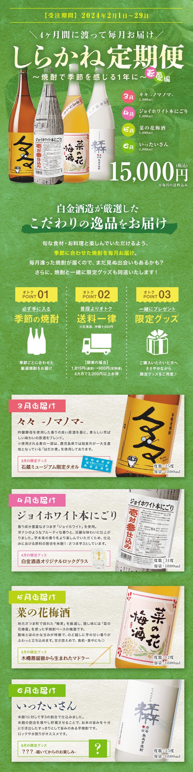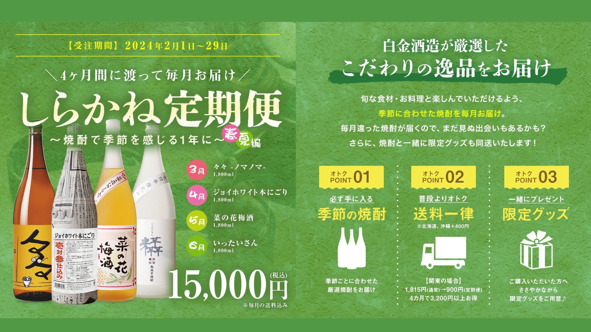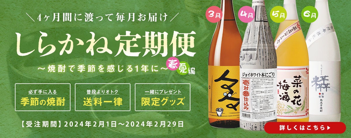 ――などの声を頂くことがありました。そこで、白金酒造直営のオンラインショップでの販売であれば【しらかね定期便】として、美味しい時期に!いち早く!確実に!お客様にお届けできるのではないかと思い2年前に実施した、白金サブスクを「しらかね定期便」と改め「春夏編」「秋冬編」と季節感あふれる定期便として実施いたします。しらかね定期便で買うからこそのおトクな特典もあり、より一層白金酒造の焼酎を楽しんでいただける企画となっております。