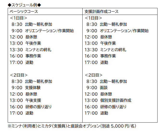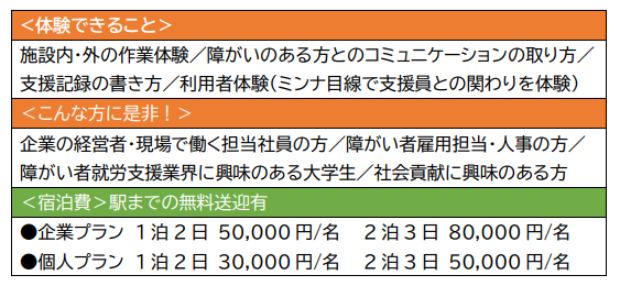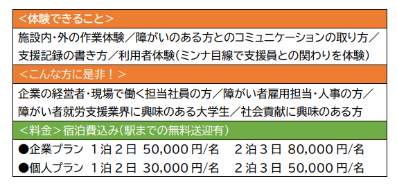 そこで、実際に障がいのあるミンナをサポートするスタッフ(支援員)体験会を実施。併設の宿泊所を使用し、1泊2日もしくは2泊3日の期間、障がいのある人たちの能力を肌で感じる事で、自社に持ち帰っていただく事ができると思います。