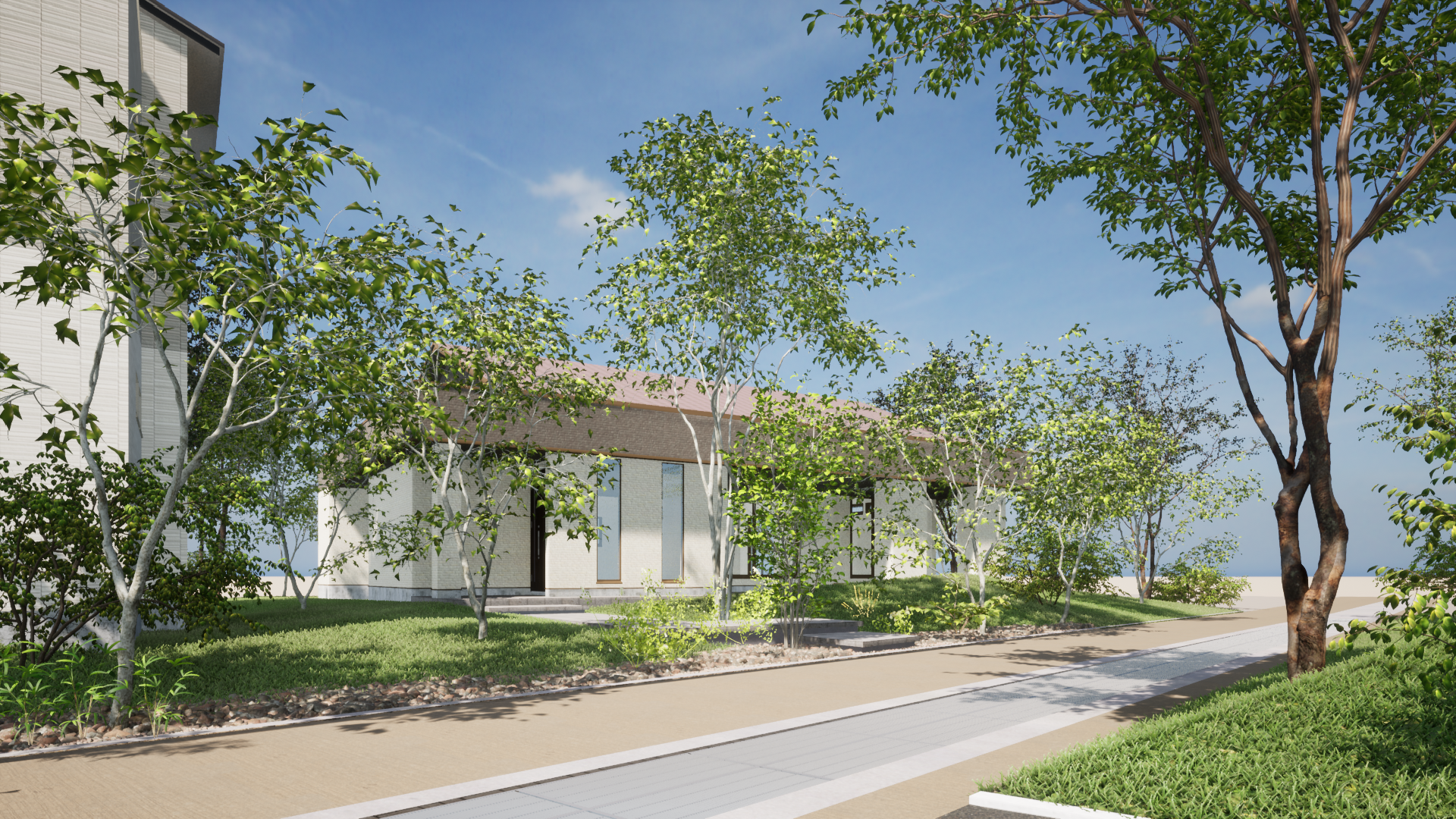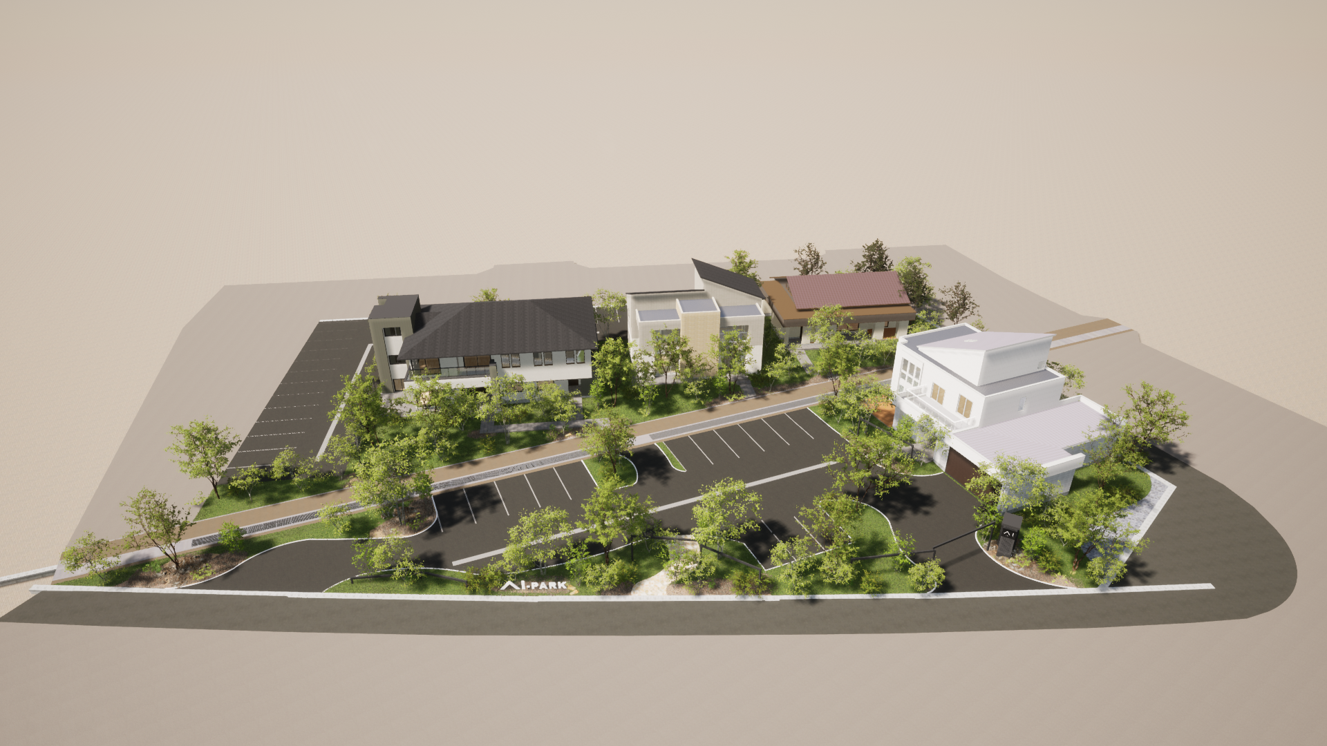 アイパーク 高岡 は、 多彩で豊かな植栽からなる森のような敷地の中に、特徴の異なる 4 棟の 住宅が建つ複合展示場です。深い軒で水平ラインを強調した寄棟屋根の「 Ees 」、暮らしをより イメージしやすい「リアルサイズ棟」、平屋でありながら縦空間の広がりを感じることができ る 「 1.3 階建て平屋」、ホワイトキューブに片流れ屋根を組合せ、大空間のガレージスペースを持 つ 「 Wis 」から構成されます。 各 棟は遊歩道でつながり、森を散歩するように見学する中で、自分達のお気に入りのスタイル を 見つけることができる新しいかたちの体験型展示場です。