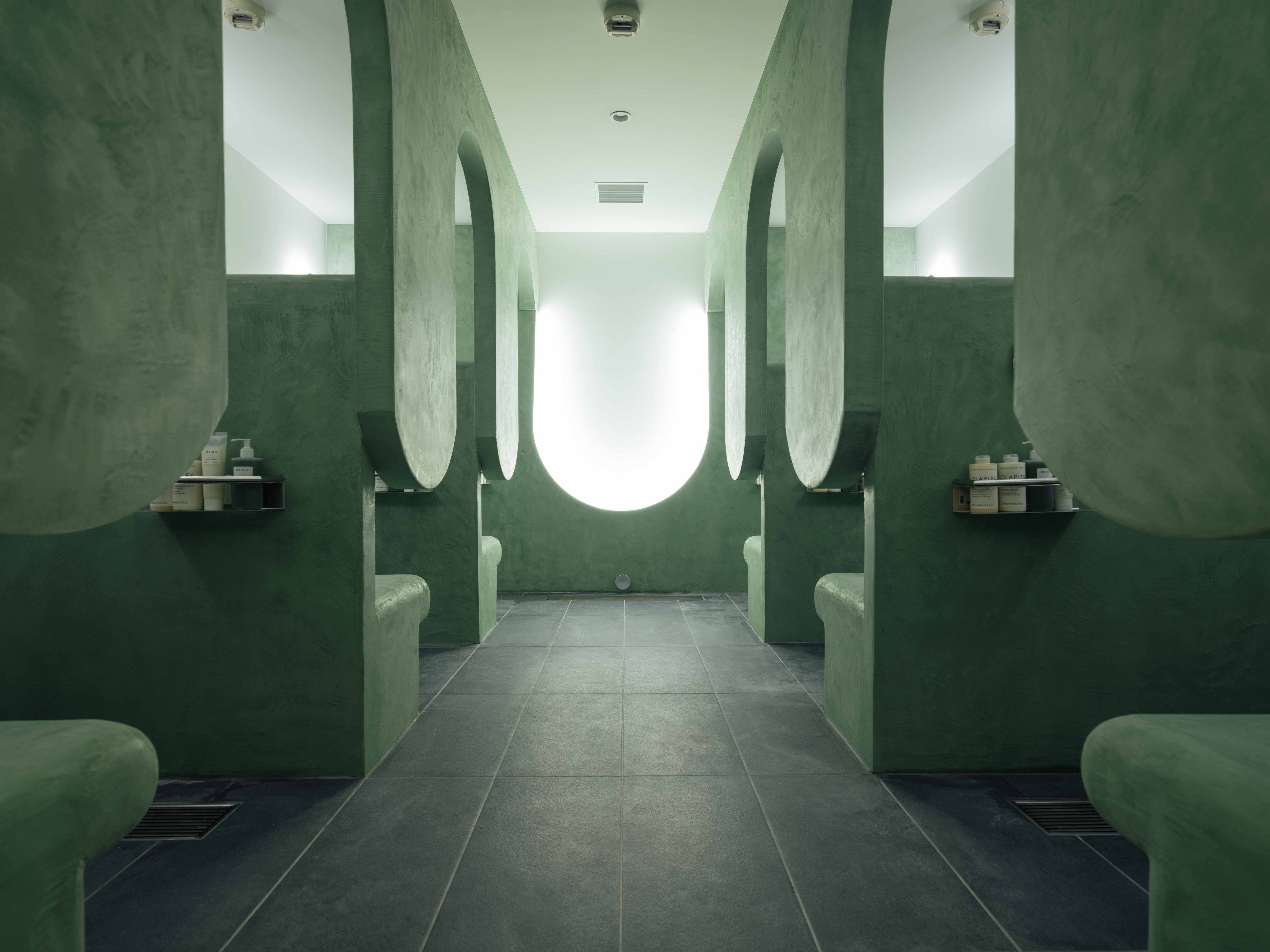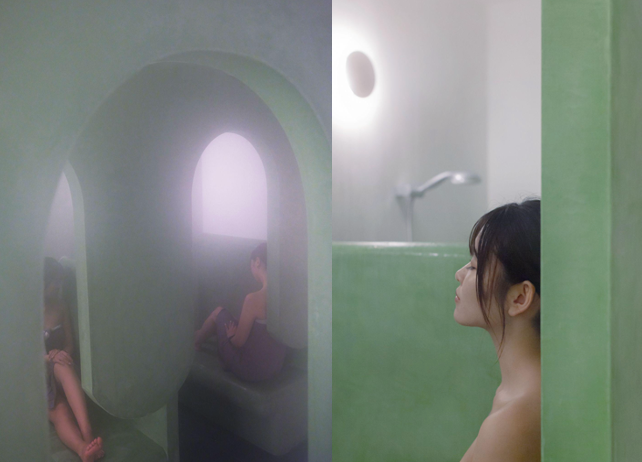 ゆったりとした半個室ブースで、ご自身のペースでこころゆくまで、肌・髪・体のセルフメンテナンスができるスチームサウナです。温度46℃・湿度100%という穏やかなサウナでありながら、空気よりも熱伝導率の高い水を媒体としたきめ細やかなスチーム効果により、しっかり深部を温めながら驚くほどの発汗を促します。まるでフェイシャルスチーマーを頭のてっぺんからつま先まで全身で浴びているかのような贅沢な蒸気の中で、クレンジング、洗顔、シャンプー、トリートメント、スクラブなど、多様なスペシャルケアとセルフメンテナンスをお楽しみいただけます。